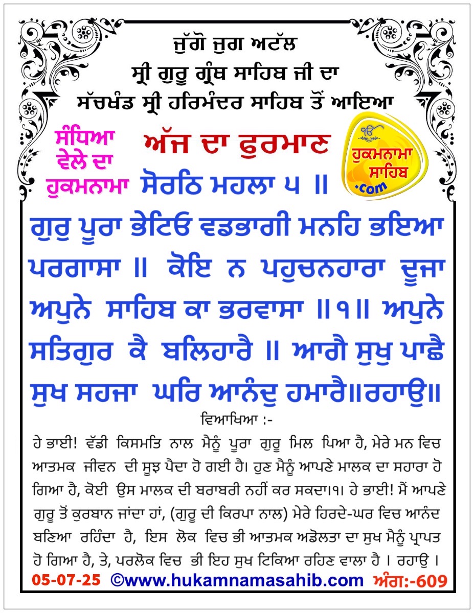 SANDHIYA VELE DA HUKAMNAMA SRI DARBAR SAHIB SRI AMRITSAR