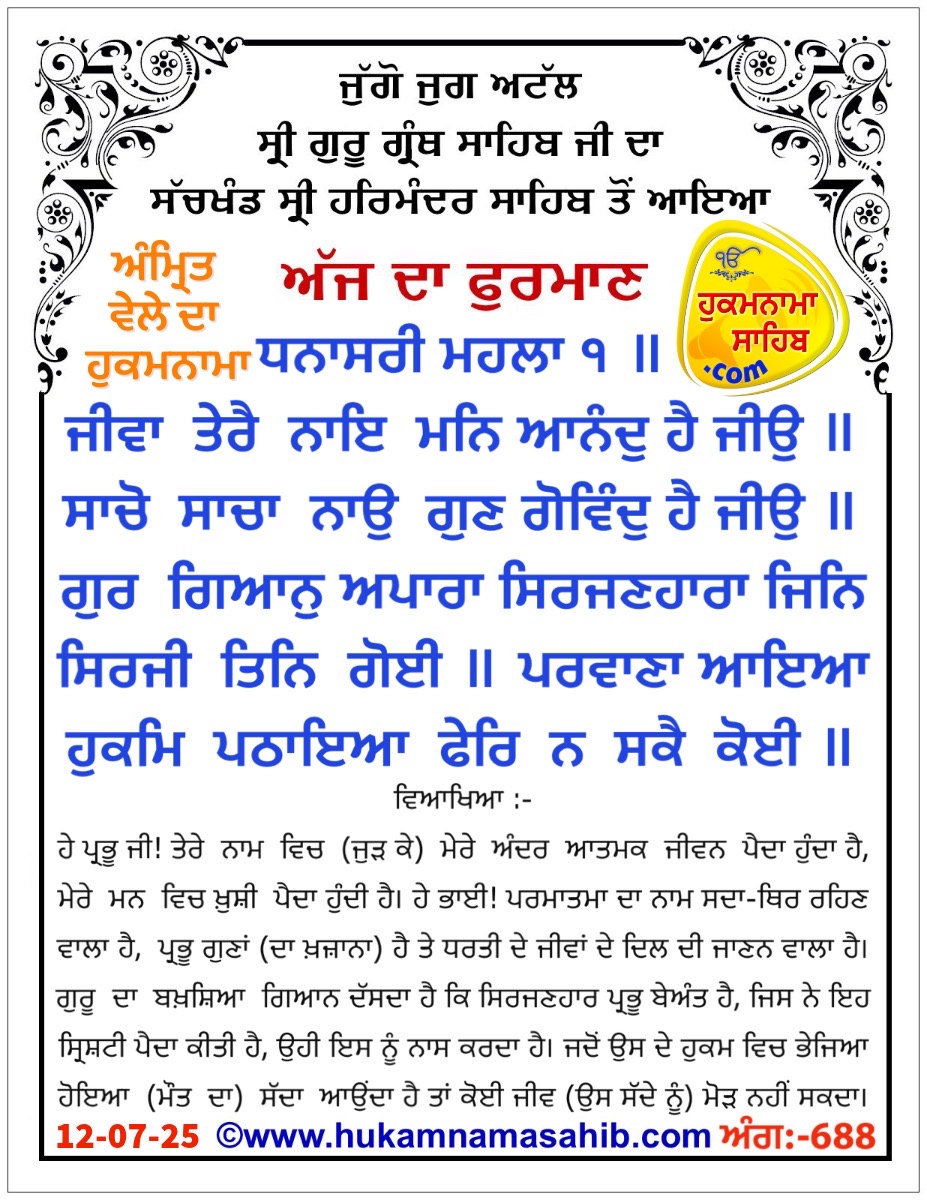 ਧਨਾਸਰੀ ਮਹਲਾ ੧ ॥ ਜੀਵਾ ਤੇਰੈ ਨਾਇ ਮਨਿ ਆਨੰਦੁ ਹੈ ਜੀਉ ॥ ਸਾਚੋ ਸਾਚਾ ਨਾਉ ਗੁਣ ਗੋਵਿੰਦੁ ਹੈ ਜੀਉ ॥ ਗੁਰ ਗਿਆਨੁ ਅਪਾਰਾ ਸਿਰਜਣਹਾਰਾ ਜਿਨਿ ਸਿਰਜੀ ਤਿਨਿ ਗੋਈ ॥ ਪਰਵਾਣਾ ਆਇਆ ਹੁਕਮਿ ਪਠਾਇਆ ਫੇਰਿ ਨ ਸਕੈ ਕੋਈ ॥ ਆਪੇ ਕਰਿ ਵੇਖੈ ਸਿਰਿ ਸਿਰਿ ਲੇਖੈ ਆਪੇ ਸੁਰਤਿ ਬੁਝਾਈ ॥ ਨਾਨਕ ਸਾਹਿਬੁ ਅਗਮ ਅਗੋਚਰੁ ਜੀਵਾ ਸਚੀ ਨਾਈ ॥੧॥ ਤੁਮ ਸਰਿ ਅਵਰੁ ਨ ਕੋਇ ਆਇਆ ਜਾਇਸੀ ਜੀਉ ॥ ਹੁਕਮੀ ਹੋਇ ਨਿਬੇੜੁ ਭਰਮੁ ਚੁਕਾਇਸੀ ਜੀਉ ॥ ਗੁਰੁ ਭਰਮੁ ਚੁਕਾਏ ਅਕਥੁ ਕਹਾਏ ਸਚ ਮਹਿ ਸਾਚੁ ਸਮਾਣਾ ॥ ਆਪਿ ਉਪਾਏ ਆਪਿ ਸਮਾਏ ਹੁਕਮੀ ਹੁਕਮੁ ਪਛਾਣਾ ॥ ਸਚੀ ਵਡਿਆਈ ਗੁਰ ਤੇ ਪਾਈ ਤੂ ਮਨਿ ਅੰਤਿ ਸਖਾਈ ॥ ਨਾਨਕ ਸਾਹਿਬੁ ਅਵਰੁ ਨ ਦੂਜਾ ਨਾਮਿ ਤੇਰੈ ਵਡਿਆਈ ॥੨॥ ਤੂ ਸਚਾ ਸਿਰਜਣਹਾਰੁ ਅਲਖ ਸਿਰੰਦਿਆ ਜੀਉ ॥ ਏਕੁ ਸਾਹਿਬੁ ਦੁਇ ਰਾਹ ਵਾਦ ਵਧੰਦਿਆ ਜੀਉ ॥ ਦੁਇ ਰਾਹ ਚਲਾਏ ਹੁਕਮਿ ਸਬਾਏ ਜਨਮਿ ਮੁਆ ਸੰਸਾਰਾ ॥ ਨਾਮ ਬਿਨਾ ਨਾਹੀ ਕੋ ਬੇਲੀ ਬਿਖੁ ਲਾਦੀ ਸਿਰਿ ਭਾਰਾ ॥ ਹੁਕਮੀ ਆਇਆ ਹੁਕਮੁ ਨ ਬੂਝੈ ਹੁਕਮਿ ਸਵਾਰਣਹਾਰਾ ॥ ਨਾਨਕ ਸਾਹਿਬੁ ਸਬਦਿ ਸਿਞਾਪੈ ਸਾਚਾ ਸਿਰਜਣਹਾਰਾ ॥੩॥ ਭਗਤ ਸੋਹਹਿ ਦਰਵਾਰਿ ਸਬਦਿ ਸੁਹਾਇਆ ਜੀਉ ॥ ਬੋਲਹਿ ਅੰਮ੍ਰਿਤ ਬਾਣਿ ਰਸਨ ਰਸਾਇਆ ਜੀਉ ॥ ਰਸਨ ਰਸਾਏ ਨਾਮਿ ਤਿਸਾਏ ਗੁਰ ਕੈ ਸਬਦਿ ਵਿਕਾਣੇ ॥ ਪਾਰਸਿ ਪਰਸਿਐ ਪਾਰਸੁ ਹੋਏ ਜਾ ਤੇਰੈ ਮਨਿ ਭਾਣੇ ॥ ਅਮਰਾ ਪਦੁ ਪਾਇਆ ਆਪੁ ਗਵਾਇਆ ਵਿਰਲਾ ਗਿਆਨ ਵੀਚਾਰੀ ॥ ਨਾਨਕ ਭਗਤ ਸੋਹਨਿ ਦਰਿ ਸਾਚੈ ਸਾਚੇ ਕੇ ਵਾਪਾਰੀ ॥੪॥ ਭੂਖ ਪਿਆਸੋ ਆਥਿ ਕਿਉ ਦਰਿ ਜਾਇਸਾ ਜੀਉ ॥ ਸਤਿਗੁਰ ਪੂਛਉ ਜਾਇ ਨਾਮੁ ਧਿਆਇਸਾ ਜੀਉ ॥ ਸਚੁ ਨਾਮੁ ਧਿਆਈ ਸਾਚੁ ਚਵਾਈ ਗੁਰਮੁਖਿ ਸਾਚੁ ਪਛਾਣਾ ॥ ਦੀਨਾ ਨਾਥੁ ਦਇਆਲੁ ਨਿਰੰਜਨੁ ਅਨਦਿਨੁ ਨਾਮੁ ਵਖਾਣਾ ॥ ਕਰਣੀ ਕਾਰ ਧੁਰਹੁ ਫੁਰਮਾਈ ਆਪਿ ਮੁਆ ਮਨੁ ਮਾਰੀ ॥ ਨਾਨਕ ਨਾਮੁ ਮਹਾ ਰਸੁ ਮੀਠਾ ਤ੍ਰਿਸਨਾ ਨਾਮਿ ਨਿਵਾਰੀ ॥੫॥੨॥