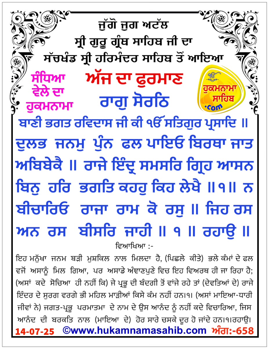Sachkhand Sri Harmandir Sahib Amritsar Vekha Hoea Sandhiya Wele Da Mukhwak: 14-07-2025Ang 658