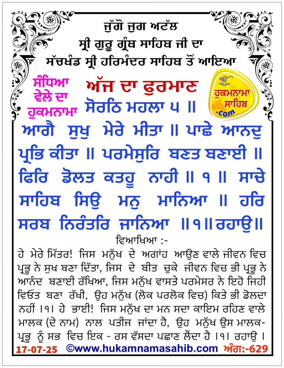 ਸੋਰਠਿ ਮਹਲਾ ੫ ॥ ਆਗੈ ਸੁਖੁ ਮੇਰੇ ਮੀਤਾ ॥ ਪਾਛੇ ਆਨਦੁ ਪ੍ਰਭਿ ਕੀਤਾ ॥ ਪਰਮੇਸੁਰਿ ਬਣਤ ਬਣਾਈ ॥ ਫਿਰਿ ਡੋਲਤ ਕਤਹੂ ਨਾਹੀ ॥੧॥ ਸਾਚੇ ਸਾਹਿਬ ਸਿਉ ਮਨੁ ਮਾਨਿਆ ॥ ਹਰਿ ਸਰਬ ਨਿਰੰਤਰਿ ਜਾਨਿਆ ॥੧॥ ਰਹਾਉ ॥ ਸਭ ਜੀਅ ਤੇਰੇ ਦਇਆਲਾ ॥ ਅਪਨੇ ਭਗਤ ਕਰਹਿ ਪ੍ਰਤਿਪਾਲਾ ॥ ਅਚਰਜੁ ਤੇਰੀ ਵਡਿਆਈ ॥ਨਿਤ ਨਾਨਕ ਨਾਮੁ ਧਿਆਈ ॥੨॥੨੩॥੮੭॥