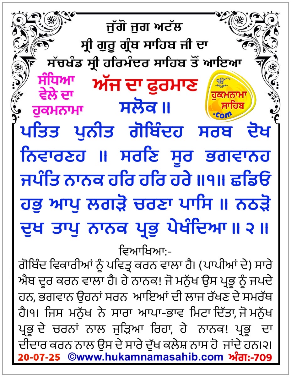 अर्थ: गोबिंद विकारियों को पवित्र करने वाला है। (पापियों के) सारे एैब दूर करने वाला है। हे नानक! जो मनुष्य उस प्रभु को जपते हैं, भगवान उन शरण आए हुओं की इज्जत रखने के समर्थ है।१। जिस मनुष्य ने सारा स्वै भाव मिटा दिया, जो मनुष्य प्रभु के चरणों के साथ जुड़ा रहा, हे नानक! प्रभु का दीदार करने से उसके सारे दुख-कष्ट नाश हो जाते हैं।२। हे दयालु! मैं तेरे दर पर आ गिरा हूँ, मुझे (अपने चरणों में) जोड़ ले। हे दीनों पर दया करने वाले! मुझे रख ले, मैं भटकता-भटकता अब बहुत थक गया हूँ। भक्ति को प्यार करना और गिरे हुओं को बचाना- ये तेरा बिरद स्वभाव है। हे प्रभु! तेरे बिना और कोई नहीं जो मेरी इस विनती को सिरे चढ़ा सके। हे दयालु! मेरा हाथ पकड़ ले (और मुझे) संसार-समुंदर में से बचा ले।१६।