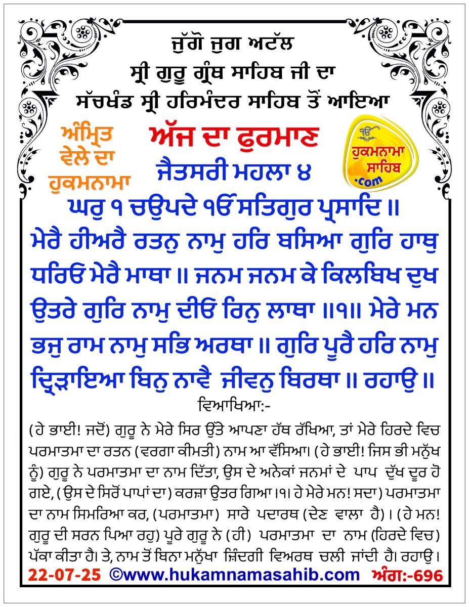 Meaning: Jaitsaree Mahalaa 4 Ghar 1 Choupade : One Universal Creator God. By The Grace Of The True Guru: The Jewel of the Lord’s Name abides within my heart; the Guru has placed His hand on my forehead. The sins and pains of countless incarnations have been cast out. The Guru has blessed me with the Naam, the Name of the Lord, and my debt has been paid off. ||1|| O my mind, vibrate the Lord’s Name, and all your affairs shall be resolved. The Perfect Guru has implanted the Lord’s Name within me; without the Name, life is useless. || Pause || Without the Guru, the self-willed manmukhs are foolish and ignorant; they are forever entangled in emotional attachment to Maya. They never serve the feet of the Holy; their lives are totally useless. ||2|| Those who serve at the feet of the Holy, the feet of the Holy, their lives are made fruitful, and they belong to the Lord. Make me the slave of the slave of the slaves of the Lord; bless me with Your Mercy, O Lord of the Universe. ||3|| I am blind, ignorant and totally without wisdom; how can I walk on the Path ? I am blind – O Guru, please let me grasp the hem of Your robe, so that Daas Nanak Ji may walk in harmony with You. ||4||1||