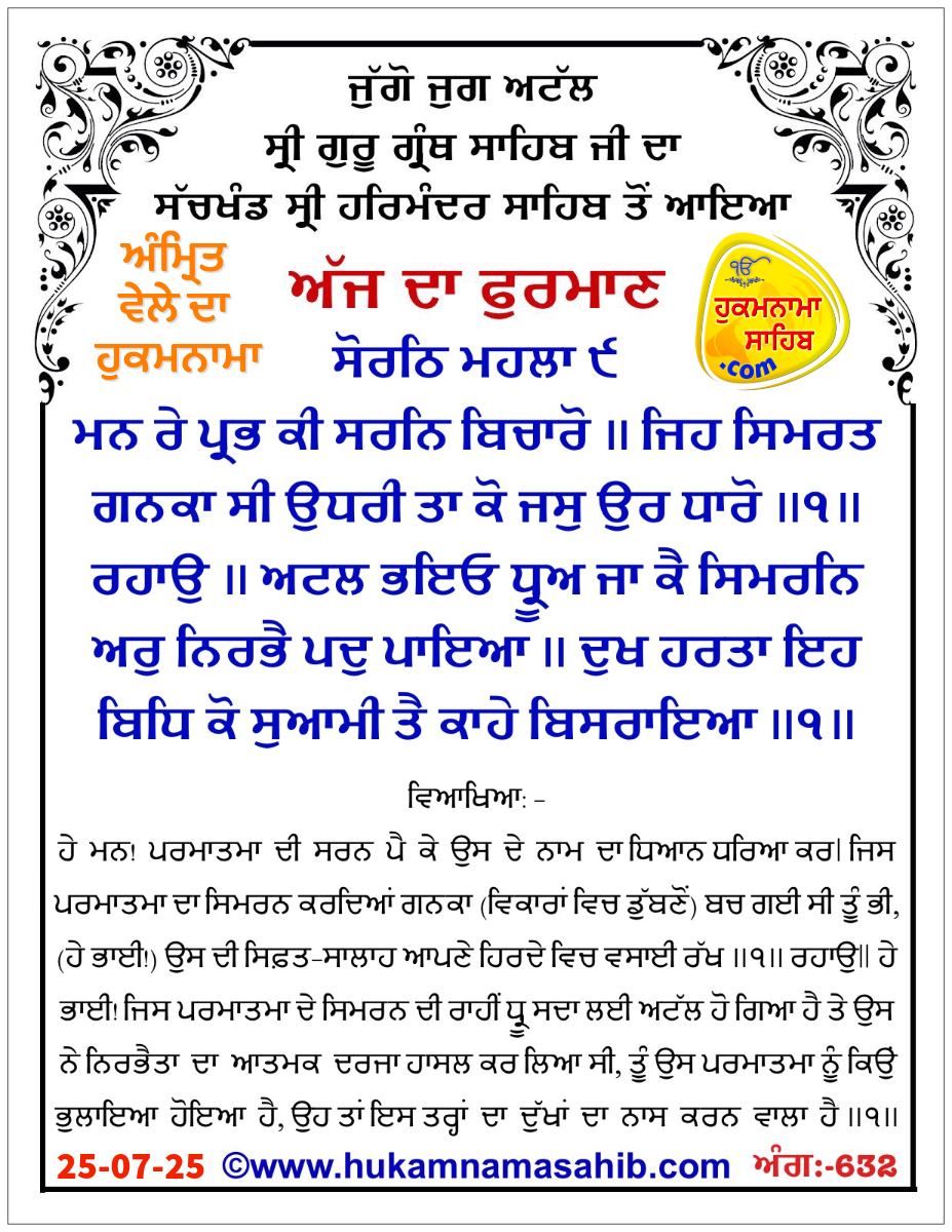 Amrit Vele Da Hukamnama Sri Darbar Sahib, Amritsar, Date 25-07-2025 Ang 632