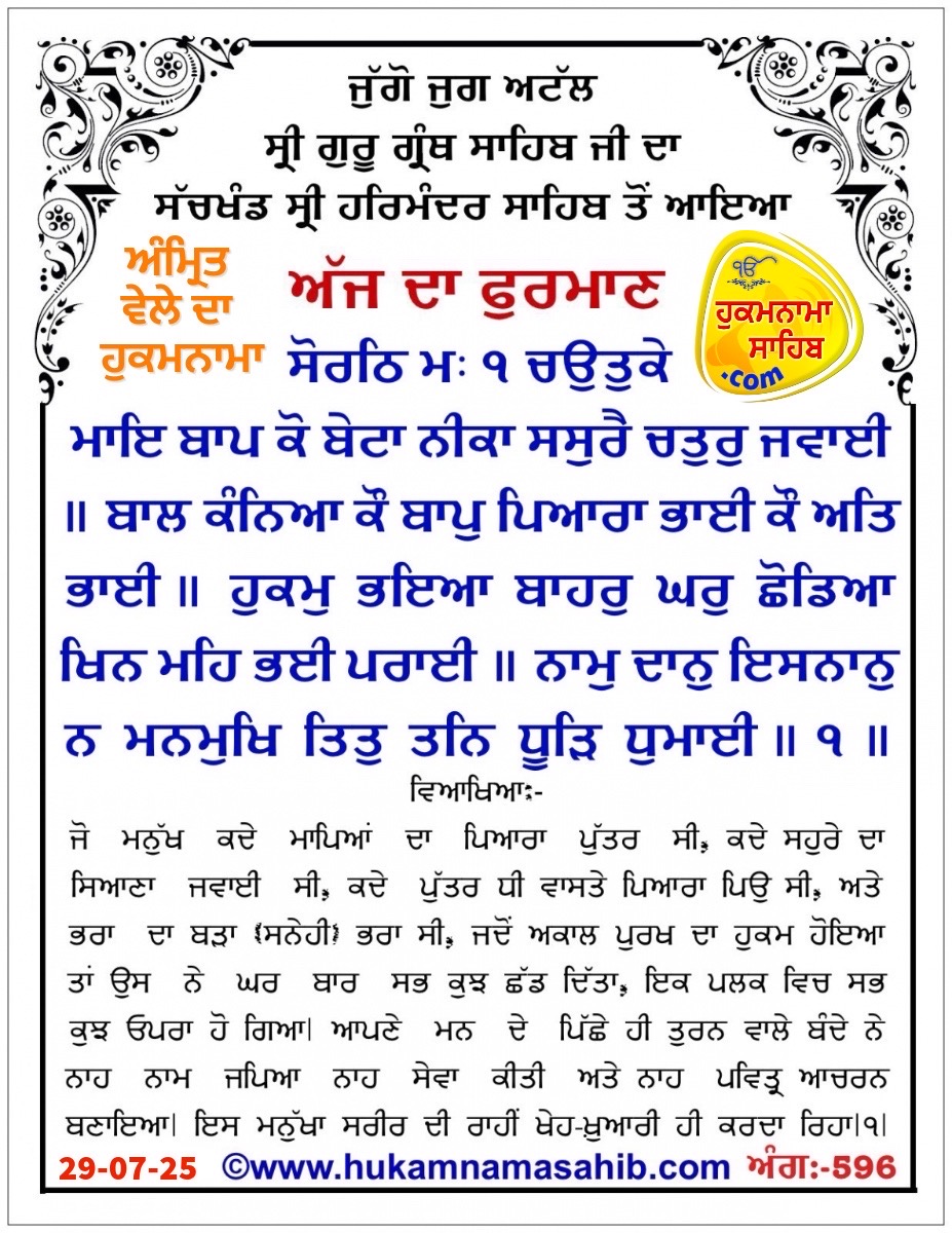 Amrit Vele da Hukamnama Sri Darbar Sahib, Amritsar Sahib, Ang 596, 29-07-25
