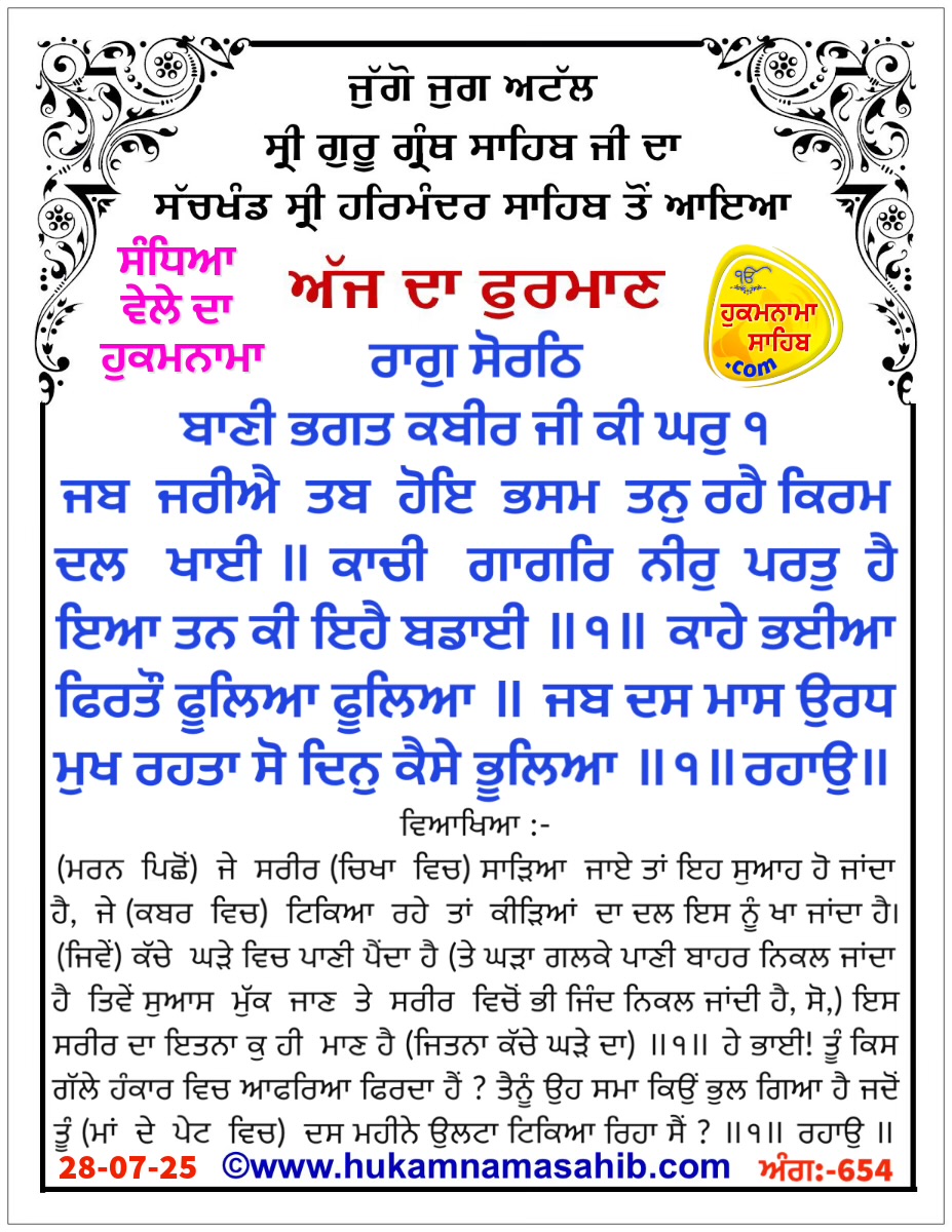 Meaning: Raag Sorath, The Word Of Devotee Kabeer Jee, First House: When the body is burnt, it turns to ashes; if it is not cremated, then it is eaten by armies of worms. The unbaked clay pitcher dissolves, when water is poured into it; this is also the nature of the body. ||1|| Why, O Siblings of Destiny, do you strut around, all puffed up with pride ? Have you forgotten those days, when you were hanging, face down, for ten months ? ||1|| Pause || Like the bee which collects honey, the fool eagerly gathers and collects wealth. At the time of death, they shout, “”Take him away, take him away! Why leave a ghost lying around ?””||2|| His wife accompanies him to the threshold, and his friends and companions beyond. All the people and relatives go as far as the cremation grounds, and then, the soul-swan goes on alone. ||3|| Says Kabeer Ji, listen, O mortal being: you have been seized by Death, and you have fallen into the deep, dark pit. You have entangled yourself in the false wealth of Maya, like the parrot caught in the trap. ||4||2||
