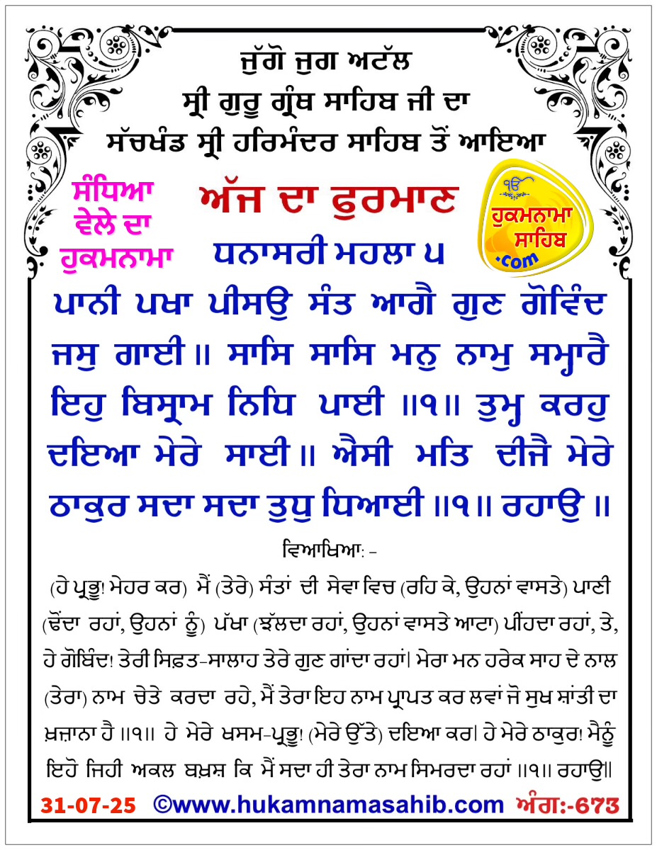 ਅਰਥ: (ਹੇ ਪ੍ਰਭੂ! ਮੇਹਰ ਕਰ) ਮੈਂ (ਤੇਰੇ) ਸੰਤਾਂ ਦੀ ਸੇਵਾ ਵਿਚ (ਰਹਿ ਕੇ, ਉਹਨਾਂ ਵਾਸਤੇ) ਪਾਣੀ (ਢੋਂਦਾ ਰਹਾਂ, ਉਹਨਾਂ ਨੂੰ) ਪੱਖਾ (ਝੱਲਦਾ ਰਹਾਂ, ਉਹਨਾਂ ਵਾਸਤੇ ਆਟਾ) ਪੀਂਹਦਾ ਰਹਾਂ, ਤੇ, ਹੇ ਗੋਬਿੰਦ! ਤੇਰੀ ਸਿਫ਼ਤ-ਸਾਲਾਹ ਤੇਰੇ ਗੁਣ ਗਾਂਦਾ ਰਹਾਂ। ਮੇਰਾ ਮਨ ਹਰੇਕ ਸਾਹ ਦੇ ਨਾਲ (ਤੇਰਾ) ਨਾਮ ਚੇਤੇ ਕਰਦਾ ਰਹੇ, ਮੈਂ ਤੇਰਾ ਇਹ ਨਾਮ ਪ੍ਰਾਪਤ ਕਰ ਲਵਾਂ ਜੋ ਸੁਖ ਸ਼ਾਂਤੀ ਦਾ ਖ਼ਜ਼ਾਨਾ ਹੈ ॥੧॥ ਹੇ ਮੇਰੇ ਖਸਮ-ਪ੍ਰਭੂ! (ਮੇਰੇ ਉੱਤੇ) ਦਇਆ ਕਰ। ਹੇ ਮੇਰੇ ਠਾਕੁਰ! ਮੈਨੂੰ ਇਹੋ ਜਿਹੀ ਅਕਲ ਬਖ਼ਸ਼ ਕਿ ਮੈਂ ਸਦਾ ਹੀ ਤੇਰਾ ਨਾਮ ਸਿਮਰਦਾ ਰਹਾਂ ॥੧॥ ਰਹਾਉ ॥ ਹੇ ਪ੍ਰਭੂ! ਤੇਰੀ ਕਿਰਪਾ ਨਾਲ (ਮੇਰਾ ਅੰਦਰੋਂ) ਮਾਇਆ ਦਾ ਮੋਹ ਮੁੱਕ ਜਾਏ, ਅਹੰਕਾਰ ਦੂਰ ਹੋ ਜਾਏ, ਮੇਰੀ ਭਟਕਣਾ ਦਾ ਨਾਸ ਹੋ ਜਾਏ, ਮੈਂ ਜਿੱਥੇ ਕਿੱਥੇ ਜਾ ਕੇ ਵੇਖਾਂ, ਸਭਨਾਂ ਵਿਚ ਮੈਨੂੰ ਤੂੰ ਆਨੰਦ-ਸਰੂਪ ਹੀ ਵੱਸਦਾ ਦਿੱਸੇਂ ॥੨॥ ਹੇ ਧਰਤੀ ਦੇ ਖਸਮ! ਤੂੰ ਦਇਆਲ ਹੈਂ, ਕਿਰਪਾਲ ਹੈਂ, ਤੂੰ ਦਇਆ ਦਾ ਖ਼ਜ਼ਾਨਾ ਹੈਂ, ਤੂੰ ਵਿਕਾਰੀਆਂ ਨੂੰ ਪਵਿੱਤ੍ਰ ਕਰਨ ਵਾਲਾ ਹੈਂ। ਜਦੋਂ ਮੈਂ ਅੱਖ ਝਮਕਣ ਜਿਤਨੇ ਸਮੇ ਲਈ ਭੀ ਮੂੰਹੋਂ ਤੇਰਾ ਨਾਮ ਉਚਾਰਦਾ ਹਾਂ, ਮੈਨੂੰ ਇਉਂ ਜਾਪਦਾ ਹੈ ਕਿ ਮੈਂ ਰਾਜ-ਭਾਗ ਦੇ ਕ੍ਰੋੜਾਂ ਸੁਖ ਆਨੰਦ ਮਾਣ ਲਏ ਹਨ ॥੩॥ ਉਹੀ ਜਾਪ ਤਾਪ ਉਹੀ ਭਗਤੀ ਸਿਰੇ ਚੜ੍ਹੀ ਜਾਣੋ, ਜੇਹੜੀ ਪਰਮਾਤਮਾ ਦੇ ਮਨ ਵਿਚ ਪਸੰਦ ਆਉਂਦੀ ਹੈ। ਹੇ ਨਾਨਕ ਜੀ! ਪਰਮਾਤਮਾ ਦਾ ਨਾਮ ਜਪਿਆਂ ਸਾਰੀ ਤ੍ਰਿਸ਼ਨਾ ਮੁੱਕ ਜਾਂਦੀ ਹੈ, (ਮਾਇਕ ਪਦਾਰਥਾਂ ਵਲੋਂ) ਪੂਰੇ ਤੌਰ ਤੇ ਰੱਜ ਜਾਈਦਾ ਹੈ ॥੪॥੧੦॥