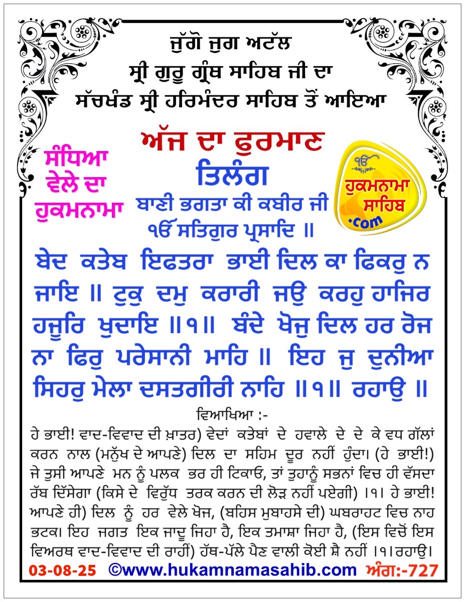 ਤਿਲੰਗ ਬਾਣੀ ਭਗਤਾ ਕੀ ਕਬੀਰ ਜੀ ੴ ਸਤਿਗੁਰ ਪ੍ਰਸਾਦਿ ॥ ਬੇਦ ਕਤੇਬ ਇਫਤਰਾ ਭਾਈ ਦਿਲ ਕਾ ਫਿਕਰੁ ਨ ਜਾਇ ॥ ਟੁਕੁ ਦਮੁ ਕਰਾਰੀ ਜਉ ਕਰਹੁ ਹਾਜਿਰ ਹਜੂਰਿ ਖੁਦਾਇ ॥੧॥ ਬੰਦੇ ਖੋਜੁ ਦਿਲ ਹਰ ਰੋਜ ਨਾ ਫਿਰੁ ਪਰੇਸਾਨੀ ਮਾਹਿ ॥ ਇਹ ਜੁ ਦੁਨੀਆ ਸਿਹਰੁ ਮੇਲਾ ਦਸਤਗੀਰੀ ਨਾਹਿ ॥੧॥ ਰਹਾਉ ॥ ਦਰੋਗੁ ਪੜਿ ਪੜਿ ਖੁਸੀ ਹੋਇ ਬੇਖਬਰ ਬਾਦੁ ਬਕਾਹਿ ॥ ਹਕੁ ਸਚੁ ਖਾਲਕੁ ਖਲਕ ਮਿਆਨੇ ਸਿਆਮ ਮੂਰਤਿ ਨਾਹਿ ॥੨॥ ਅਸਮਾਨ ਮ੍ਹਿਾਨੇ ਲਹੰਗ ਦਰੀਆ ਗੁਸਲ ਕਰਦਨ ਬੂਦ ॥ ਕਰਿ ਫਕਰੁ ਦਾਇਮ ਲਾਇ ਚਸਮੇ ਜਹ ਤਹਾ ਮਉਜੂਦੁ ॥੩॥ ਅਲਾਹ ਪਾਕੰ ਪਾਕ ਹੈ ਸਕ ਕਰਉ ਜੇ ਦੂਸਰ ਹੋਇ ॥ ਕਬੀਰ ਕਰਮੁ ਕਰੀਮ ਕਾ ਉਹੁ ਕਰੈ ਜਾਨੈ ਸੋਇ ॥੪॥੧॥