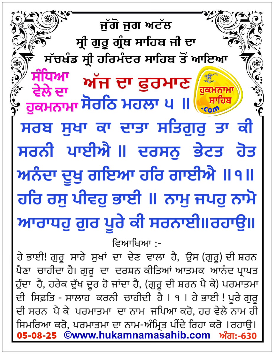 Sandhia vele da Hukamnama Sri Darbar Sahib, Sri Amritsar, Ang 630, 05-08-2025