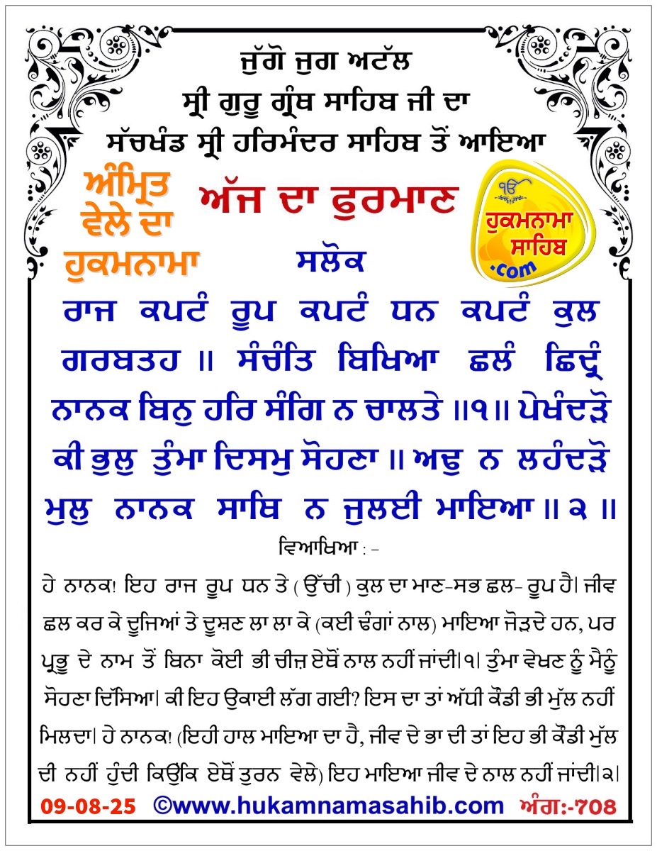 Amrit Vele Da Hukamnama Sri Darbar Sahib, Amritsar, Date 09-08-2025 Ang 708