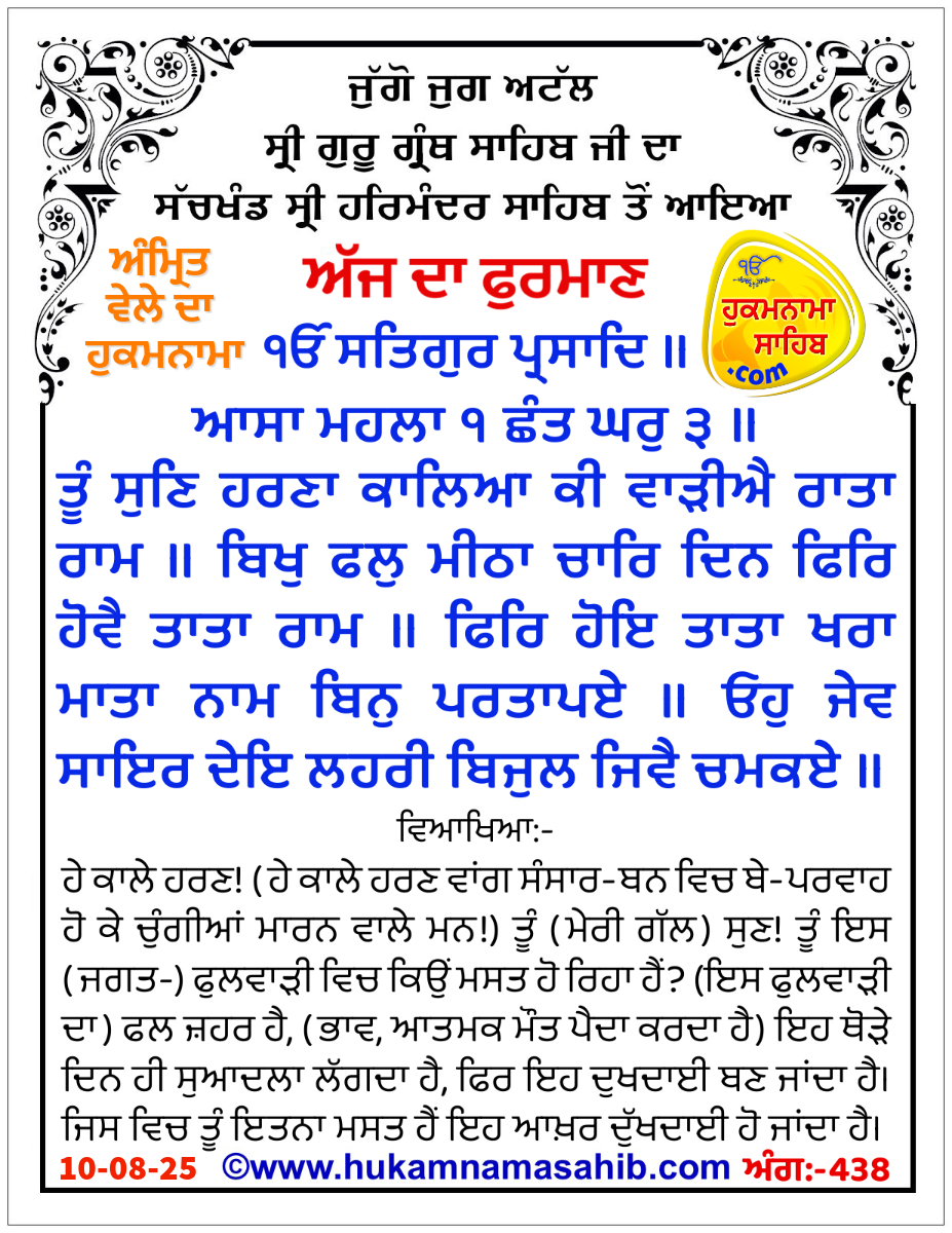 Amritvele da Hukamnama Sri Darbar Sahib, Sri Amritsar, Ang 438, 10-Aug-2025