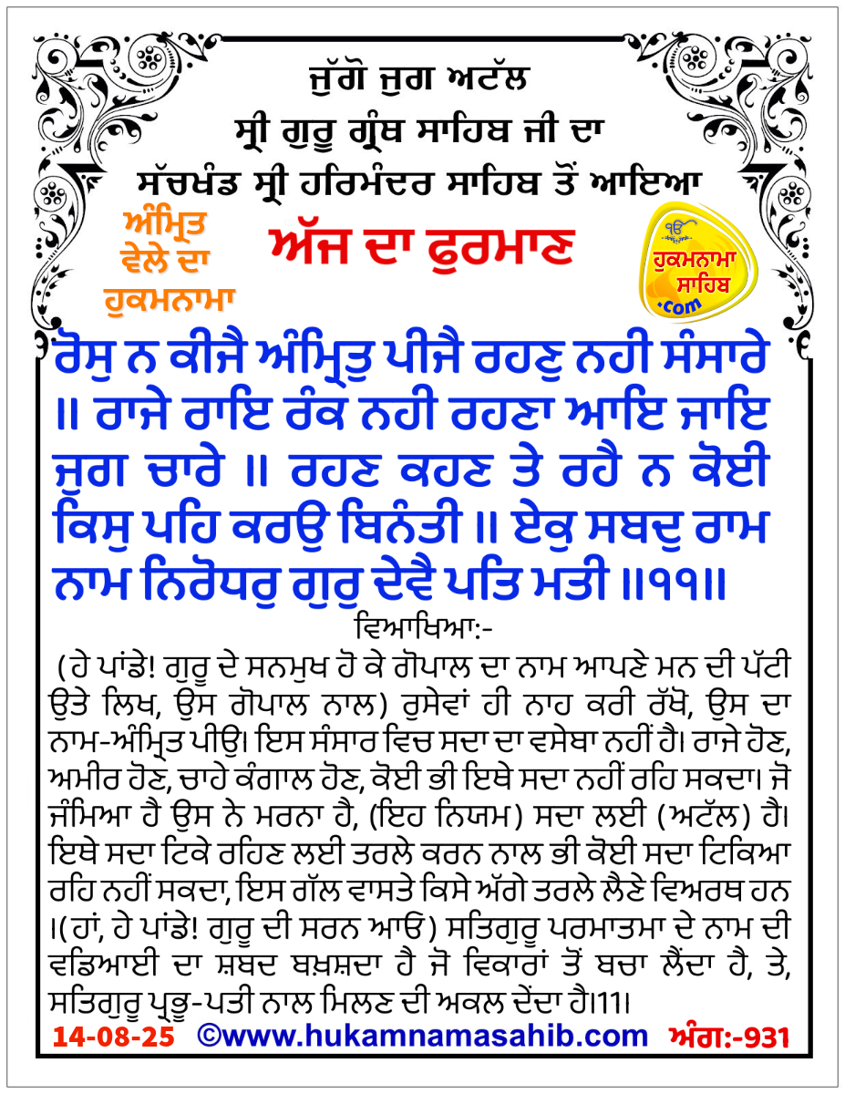 Amrit Vele Da Hukamnama Sri Darbar Sahib, Amritsar, Date 14-08-2025 Ang 931