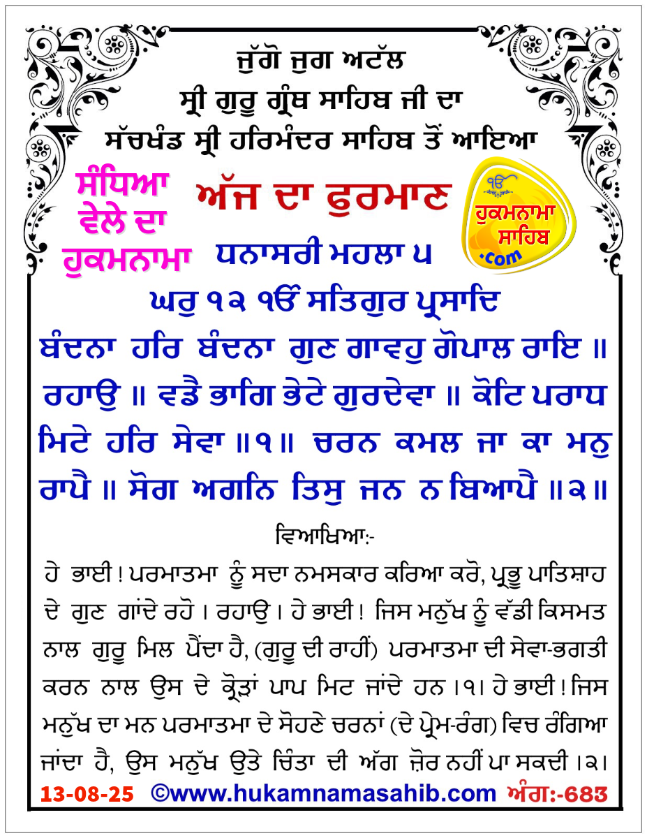 Sandhia Vele Da Hukamnama Sri Darbar Sahib, Amritsar, Date 13-08-2025 Ang 683