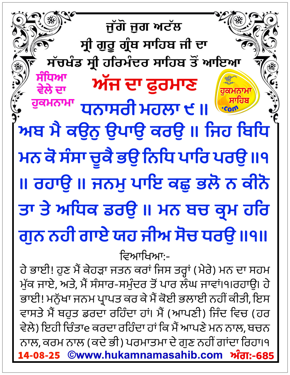 Sandhia Vele Da Hukamnama Sri Darbar Sahib, Amritsar, Date 14-08-2025 Ang 685