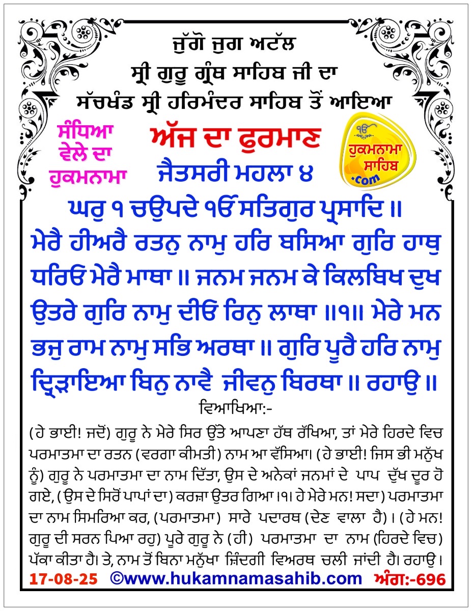 ਅਰਥ: ਰਾਗ ਜੈਤਸਰੀ, ਘਰ ੧ ਵਿੱਚ ਗੁਰੂ ਰਾਮਦਾਸ ਜੀ ਦੀ ਚਾਰ-ਬੰਦਾਂ ਵਾਲੀ ਬਾਣੀ। ਅਕਾਲ ਪੁਰਖ ਇੱਕ ਹੈ ਅਤੇ ਸਤਿਗੁਰੂ ਦੀ ਕਿਰਪਾ ਨਾਲ ਮਿਲਦਾ ਹੈ। (ਹੇ ਭਾਈ! ਜਦੋਂ) ਗੁਰੂ ਨੇ ਮੇਰੇ ਸਿਰ ਉੱਤੇ ਆਪਣਾ ਹੱਥ ਰੱਖਿਆ, ਤਾਂ ਮੇਰੇ ਹਿਰਦੇ ਵਿਚ ਪਰਮਾਤਮਾ ਦਾ ਰਤਨ (ਵਰਗਾ ਕੀਮਤੀ) ਨਾਮ ਆ ਵੱਸਿਆ। (ਹੇ ਭਾਈ! ਜਿਸ ਭੀ ਮਨੁੱਖ ਨੂੰ) ਗੁਰੂ ਨੇ ਪਰਮਾਤਮਾ ਦਾ ਨਾਮ ਦਿੱਤਾ, ਉਸ ਦੇ ਅਨੇਕਾਂ ਜਨਮਾਂ ਦੇ ਪਾਪ ਦੁੱਖ ਦੂਰ ਹੋ ਗਏ, (ਉਸ ਦੇ ਸਿਰੋਂ ਪਾਪਾਂ ਦਾ) ਕਰਜ਼ਾ ਉਤਰ ਗਿਆ ॥੧॥ ਹੇ ਮੇਰੇ ਮਨ! (ਸਦਾ) ਪਰਮਾਤਮਾ ਦਾ ਨਾਮ ਸਿਮਰਿਆ ਕਰ, (ਪਰਮਾਤਮਾ) ਸਾਰੇ ਪਦਾਰਥ (ਦੇਣ ਵਾਲਾ ਹੈ)। (ਹੇ ਮਨ! ਗੁਰੂ ਦੀ ਸਰਨ ਪਿਆ ਰਹੁ) ਪੂਰੇ ਗੁਰੂ ਨੇ (ਹੀ) ਪਰਮਾਤਮਾ ਦਾ ਨਾਮ (ਹਿਰਦੇ ਵਿਚ) ਪੱਕਾ ਕੀਤਾ ਹੈ। ਤੇ, ਨਾਮ ਤੋਂ ਬਿਨਾ ਮਨੁੱਖਾ ਜ਼ਿੰਦਗੀ ਵਿਅਰਥ ਚਲੀ ਜਾਂਦੀ ਹੈ ॥ ਰਹਾਉ ॥ ਹੇ ਭਾਈ! ਜੇਹੜੇ ਮਨੁੱਖ ਆਪਣੇ ਮਨ ਦੇ ਪਿੱਛੇ ਤੁਰਦੇ ਹਨ ਉਹ ਗੁਰੂ (ਦੀ ਸਰਨ) ਤੋਂ ਬਿਨਾ ਮੂਰਖ ਹੋਏ ਰਹਿੰਦੇ ਹਨ, ਉਹ ਸਦਾ ਮਾਇਆ ਦੇ ਮੋਹ ਵਿਚ ਫਸੇ ਰਹਿੰਦੇ ਹਨ। ਉਹਨਾਂ ਨੇ ਕਦੇ ਭੀ ਗੁਰੂ ਦਾ ਆਸਰਾ ਨਹੀਂ ਲਿਆ, ਉਹਨਾਂ ਦਾ ਸਾਰਾ ਜੀਵਨ ਵਿਅਰਥ ਚਲਾ ਜਾਂਦਾ ਹੈ ॥੨॥ ਹੇ ਭਾਈ! ਜੇਹੜੇ ਮਨੁੱਖ ਗੁਰੂ ਦੇ ਚਰਨਾਂ ਦੀ ਓਟ ਲੈਂਦੇ ਹਨ, ਉਹ ਖਸਮ ਵਾਲੇ ਬਣ ਜਾਂਦੇ ਹਨ, ਉਹਨਾਂ ਦੀ ਜ਼ਿੰਦਗੀ ਕਾਮਯਾਬ ਹੋ ਜਾਂਦੀ ਹੈ। ਹੇ ਹਰੀ! ਹੇ ਜਗਤ ਦੇ ਨਾਥ! ਮੇਰੇ ਉੱਤੇ ਮੇਹਰ ਕਰ, ਮੈਨੂੰ ਆਪਣੇ ਦਾਸਾਂ ਦੇ ਦਾਸਾਂ ਦਾ ਦਾਸ ਬਣਾ ਲੈ ॥੩॥ ਹੇ ਗੁਰੂ! ਅਸੀ ਮਾਇਆ ਵਿਚ ਅੰਨ੍ਹੇ ਹੋ ਰਹੇ ਹਾਂ, ਅਸੀਂ ਆਤਮਕ ਜੀਵਨ ਦੀ ਸੂਝ ਤੋਂ ਸੱਖਣੇ ਹਾਂ, ਸਾਨੂੰ ਸਹੀ ਜੀਵਨ-ਜੁਗਤਿ ਦੀ ਸੂਝ ਨਹੀਂ ਹੈ, ਅਸੀ ਤੇਰੇ ਦੱਸੇ ਹੋਏ ਜੀਵਨ-ਰਾਹ ਉੱਤੇ ਤੁਰ ਨਹੀਂ ਸਕਦੇ। ਦਾਸ ਨਾਨਕ ਜੀ! (ਆਖੋ—) ਹੇ ਗੁਰੂ! ਸਾਨੂੰ ਅੰਨ੍ਹਿਆਂ ਨੂੰ ਆਪਣਾ ਪੱਲਾ ਫੜਾ, ਤਾਂ ਕਿ ਤੇਰੇ ਪੱਲੇ ਲੱਗ ਕੇ ਅਸੀ ਤੇਰੇ ਦੱਸੇ ਹੋਏ ਰਸਤੇ ਉਤੇ ਤੁਰ ਸਕੀਏ ॥੪॥੧॥