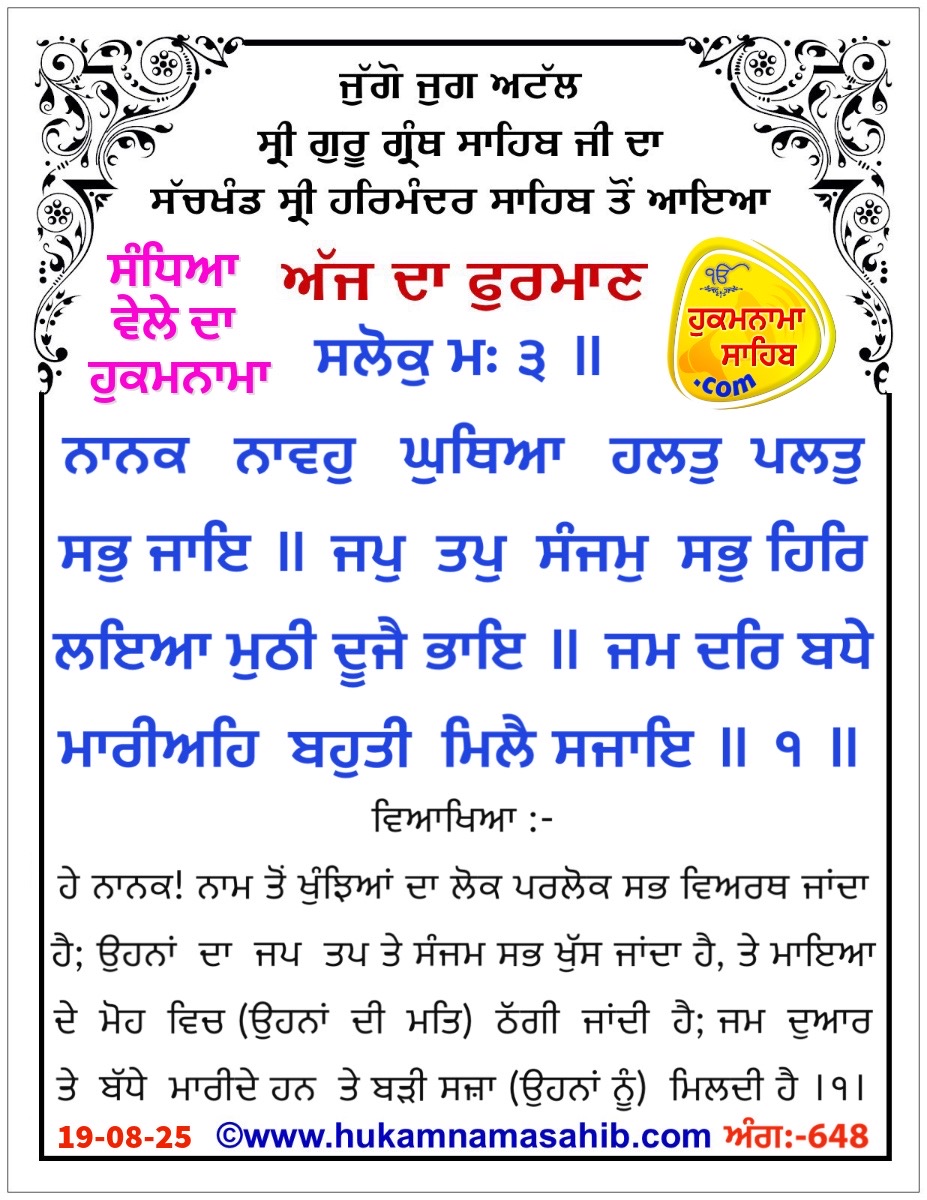Sandhia Vele Da Hukamnama Sri Darbar Sahib, Amritsar, Date 19-08-2025 Ang 648