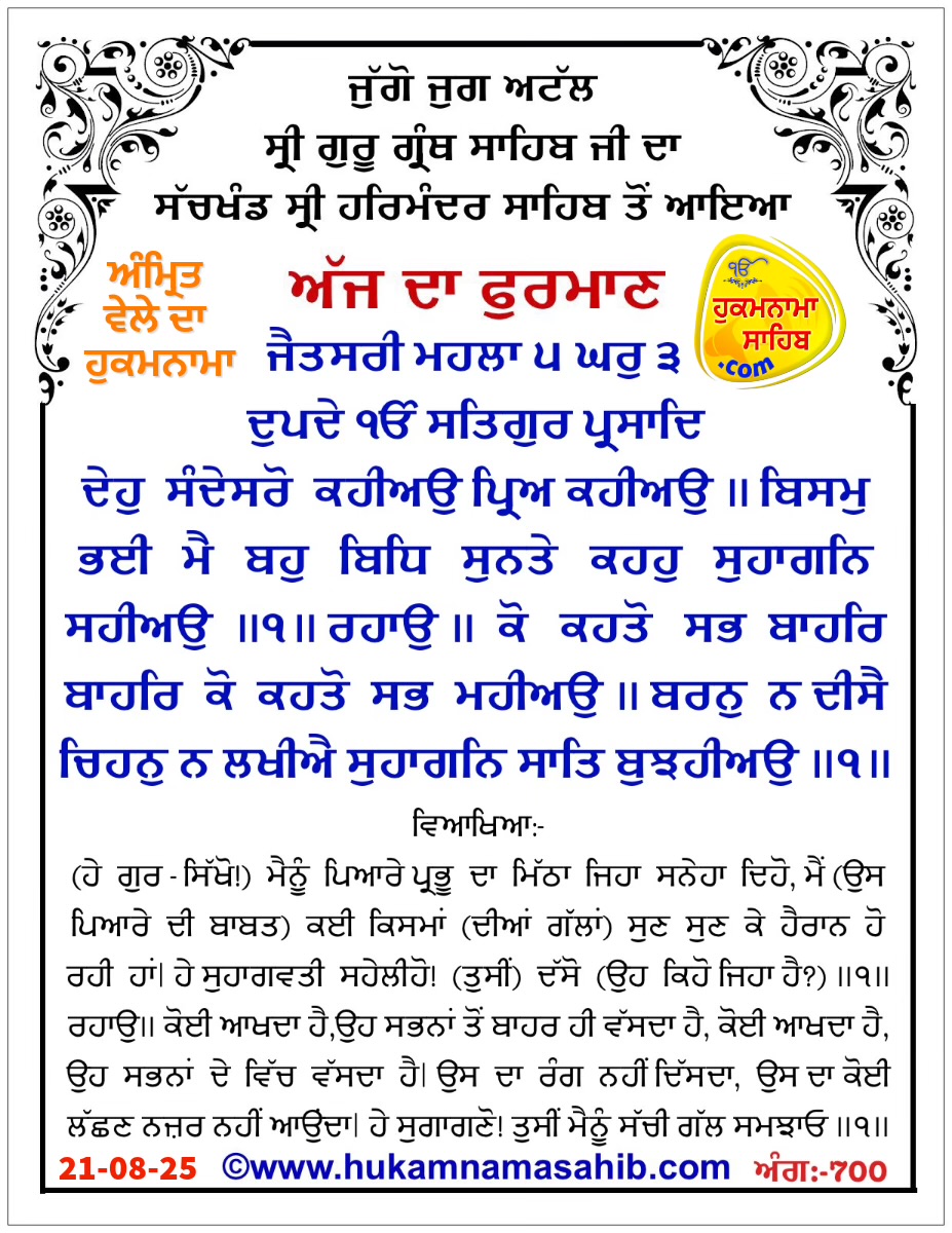 Meaning: Jaitsaree Mahalaa 5 Ghar 3 Dupade One Universal Creator God. By The Grace Of The True Guru: Give me a message from my Beloved – tell me, tell me! I am wonder-struck, hearing the many reports of Him; tell them to me, O my happy sister soul-brides. ||1|| Pause || Some say that He is beyond the world – totally beyond it, while others say that He is totally within it. His color cannot be seen, and His pattern cannot be discerned. O happy soul-brides, tell me the truth! ||1|| He is pervading everywhere, and He dwells in each and every heart; He is not stained – He is unstained. Says Nanak Ji, listen, O people: He dwells upon the tongues of the Saints. ||2||1||2||