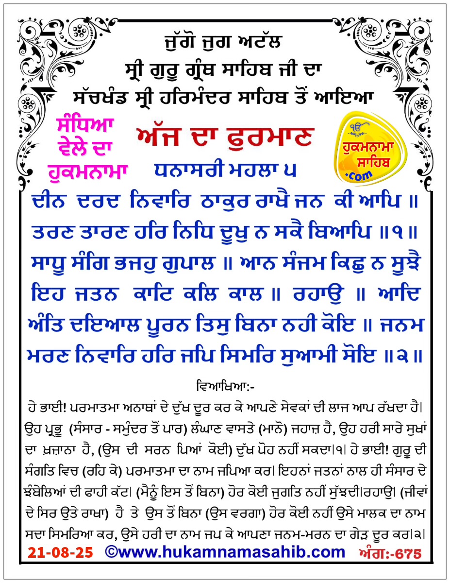 SANDHIYA VELE DA HUKAMNAMA SRI DARBAR SAHIB SRI AMRITSAR