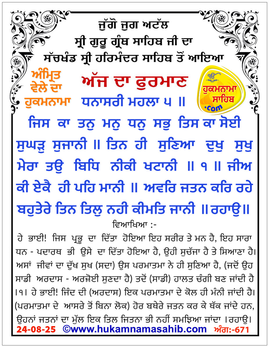 Amrit Vele Da Hukamnama Sri Darbar Sahib, Amritsar, Date 24-08-2025 Ang 671