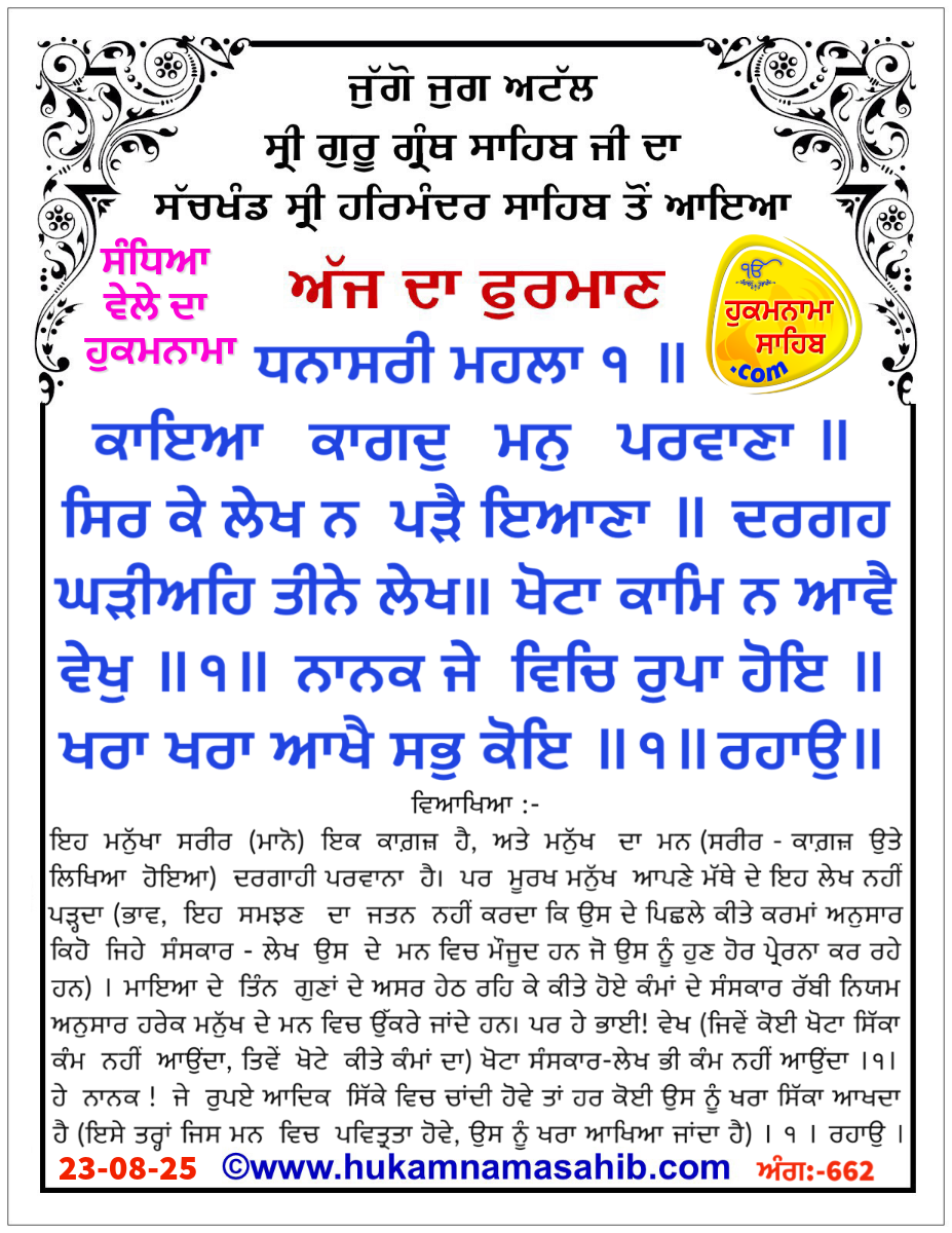 Sachkhand Sri Harmandir Sahib Amritsar Vikhe Hoea Sandhia Vele Da Mukhwak Ang 662 : 23-08-25