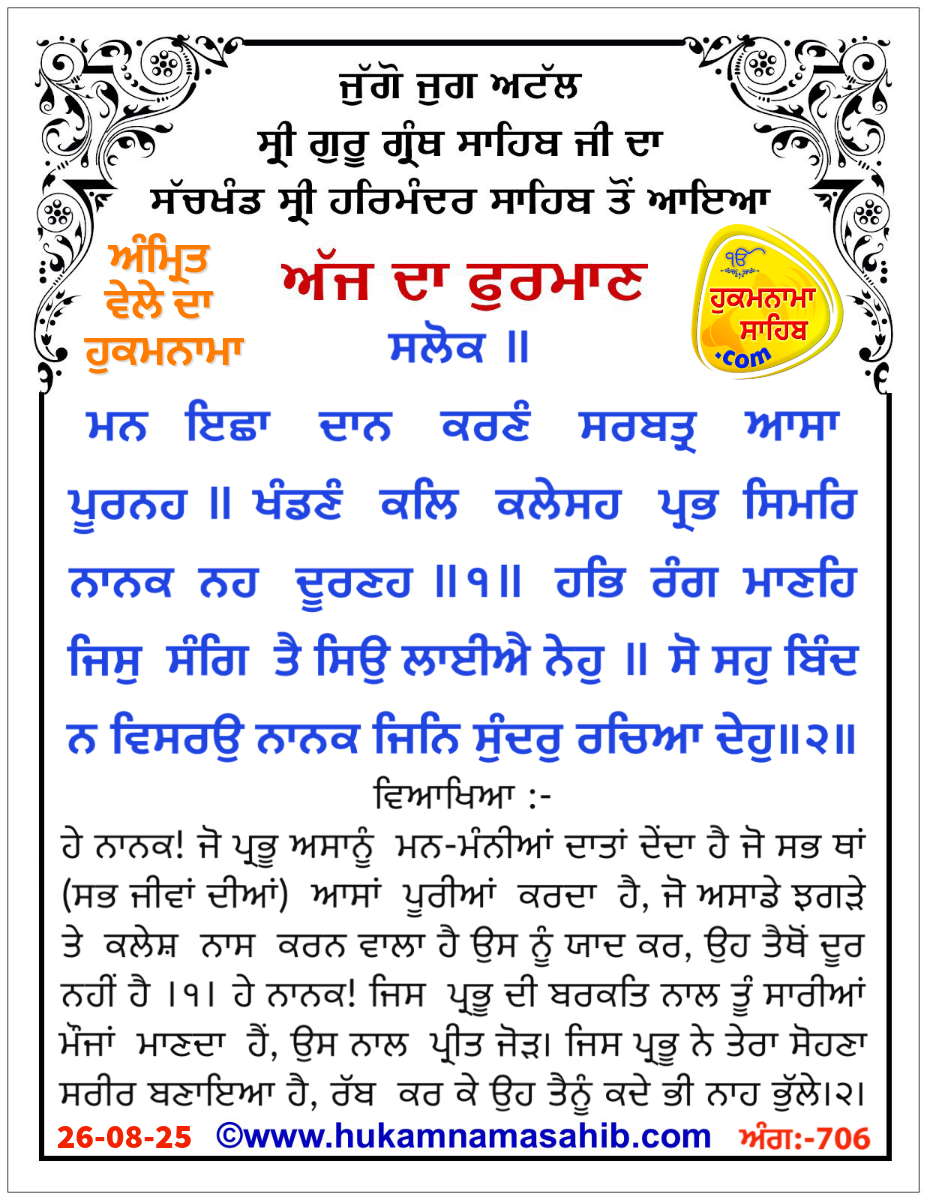 Meaning: He grants our hearts’ desires, and fulfills all our hopes. He destroys pain and suffering; remember God in meditation, O Nanak Ji – He is not far away. ||1|| Love Him, with whom you enjoy all pleasures. Do not forget that Lord, even for an instant; O Nanak Ji, He fashioned this beautiful body. ||2|| Pauree: He gave you your soul, breath of life, body and wealth; He gave you pleasures to enjoy. He gave you households, mansions, chariots and horses; He ordained your good destiny. He gave you your children, spouse, friends and servants; God is the all-powerful Great Giver. Meditating in remembrance on the Lord, the body and mind are rejuvenated, and sorrow departs. In the Saadh Sangat, the Company of the Holy, chant the Praises of the Lord, and all your sickness shall vanish. ||3||