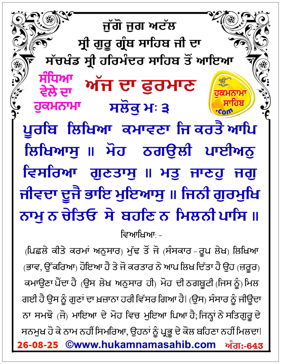 Sandhia Wele Da Hukamnama Sachkhand Sri Harmandir Sahib Amritsar