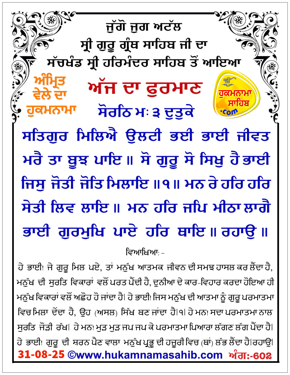 ਸੋਰਠਿ ਮ: ੩ ਦੁਤੁਕੇ ॥ ਸਤਿਗੁਰ ਮਿਲਿਐ ਉਲਟੀ ਭਈ ਭਾਈ ਜੀਵਤ ਮਰੈ ਤਾ ਬੂਝ ਪਾਇ ॥ ਸੋ ਗੁਰੂ ਸੋ ਸਿਖੁ ਹੈ ਭਾਈ ਜਿਸੁ ਜੋਤੀ ਜੋਤਿ ਮਿਲਾਇ ॥੧॥ ਮਨ ਰੇ ਹਰਿ ਹਰਿ ਸੇਤੀ ਲਿਵ ਲਾਇ ॥ ਮਨ ਹਰਿ ਜਪਿ ਮੀਠਾ ਲਾਗੈ ਭਾਈ ਗੁਰਮੁਖਿ ਪਾਏ ਹਰਿ ਥਾਇ ॥ ਰਹਾਉ ॥ ਬਿਨੁ ਗੁਰ ਪ੍ਰੀਤਿ ਨ ਊਪਜੈ ਭਾਈ ਮਨਮੁਖਿ ਦੂਜੈ ਭਾਇ ॥ ਤੁਹ ਕੁਟਹਿ ਮਨਮੁਖ ਕਰਮ ਕਰਹਿ ਭਾਈ ਪਲੈ ਕਿਛੂ ਨ ਪਾਇ ॥੨॥ ਗੁਰ ਮਿਲਿਐ ਨਾਮੁ ਮਨਿ ਰਵਿਆ ਭਾਈ ਸਾਚੀ ਪ੍ਰੀਤਿ ਪਿਆਰਿ ॥ ਸਦਾ ਹਰਿ ਕੇ ਗੁਣ ਰਵੈ ਭਾਈ ਗੁਰ ਕੈ ਹੇਤਿ ਅਪਾਰਿ ॥੩॥ ਆਇਆ ਸੋ ਪਰਵਾਣੁ ਹੈ ਭਾਈ ਜਿ ਗੁਰ ਸੇਵਾ ਚਿਤੁ ਲਾਇ ॥ ਨਾਨਕ ਨਾਮੁ ਹਰਿ ਪਾਈਐ ਭਾਈ ਗੁਰ ਸਬਦੀ ਮੇਲਾਇ ॥੪॥੮॥