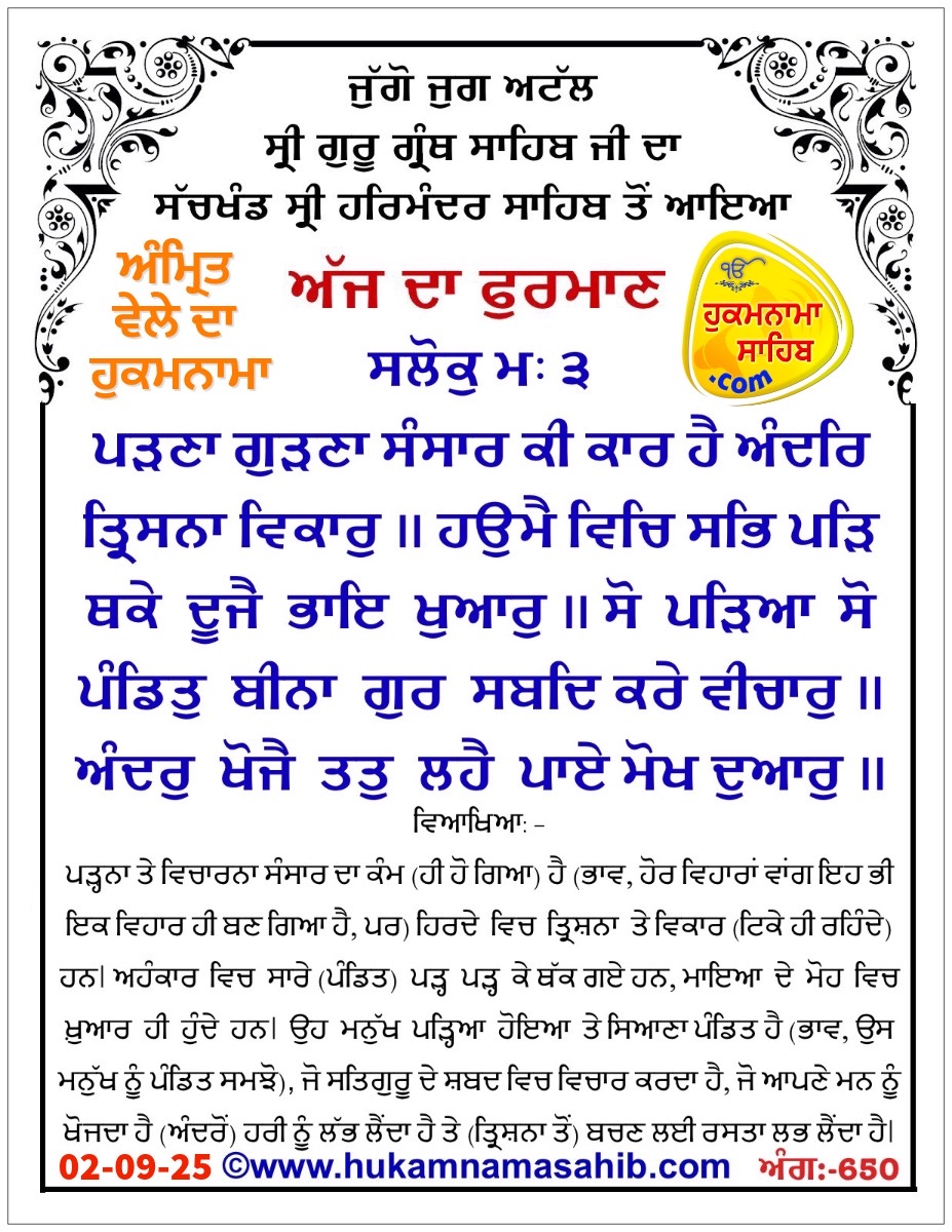 Amrit Vele Da Hukamnama Sri Darbar Sahib, Amritsar, Date 02-09-2025 Ang 650