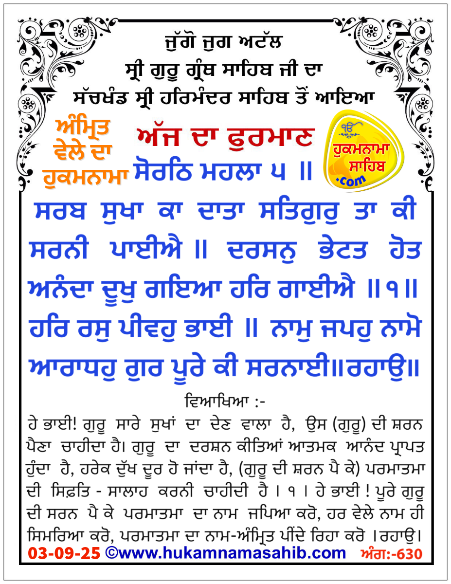 Amrit vele da Hukamnama Sri Darbar Sahib, Sri Amritsar, Ang 630, 03-09-2025