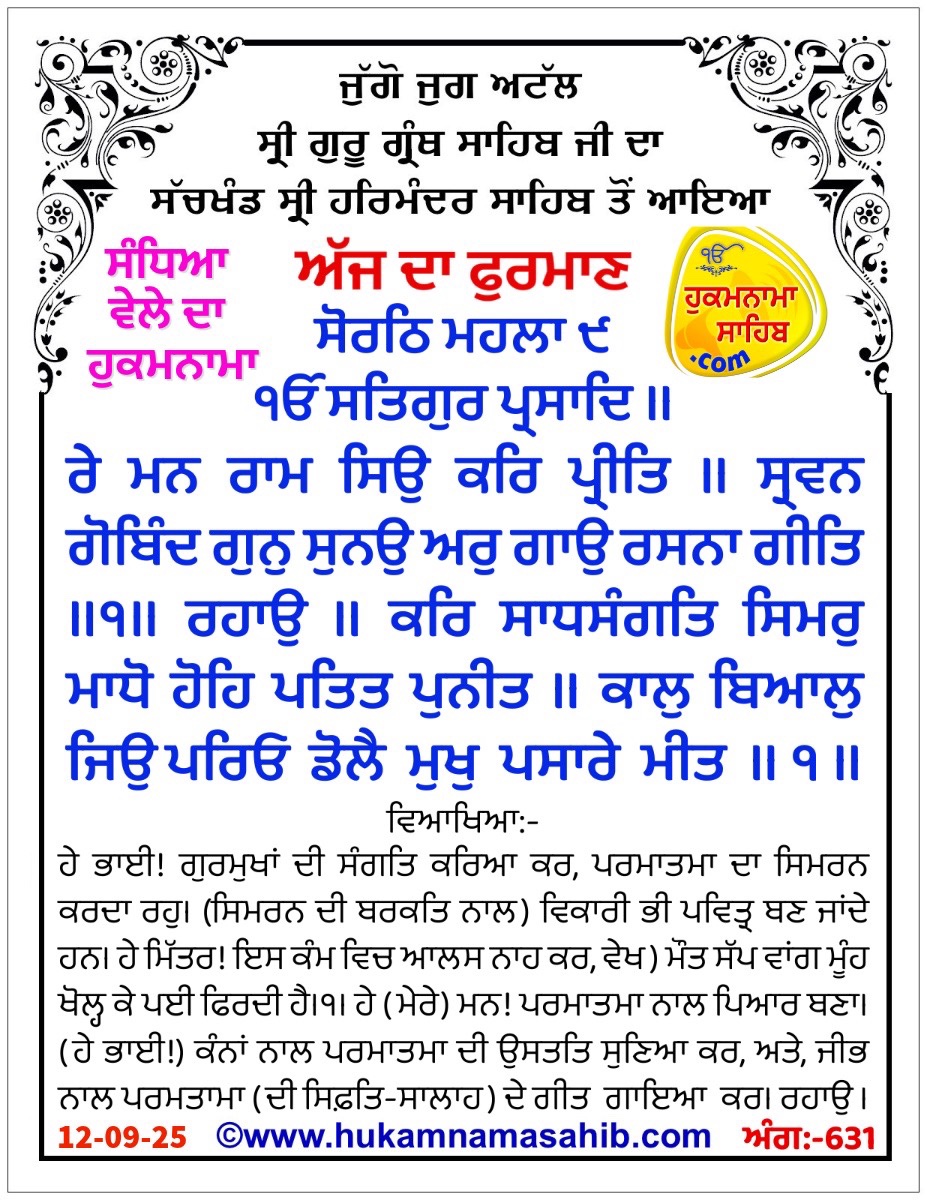 Sandhya vele da Hukamnama Sri Darbar Sahib Amritsar