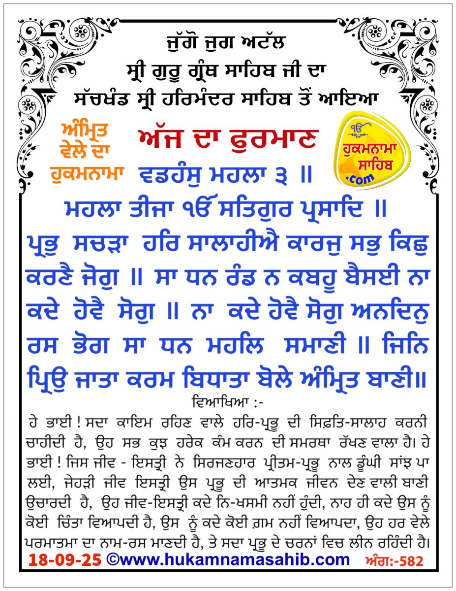 Amrit Vele Da Hukamnama Sri Darbar Sahib Amritsar Ang – 582, 18-09-2025