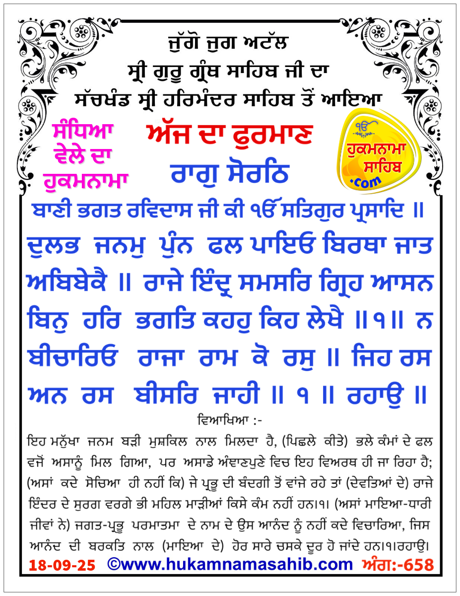 Sandhia Vele Da Hukamnama Sri Darbar Sahib, Amritsar, Date 18-09-2025 Ang 658