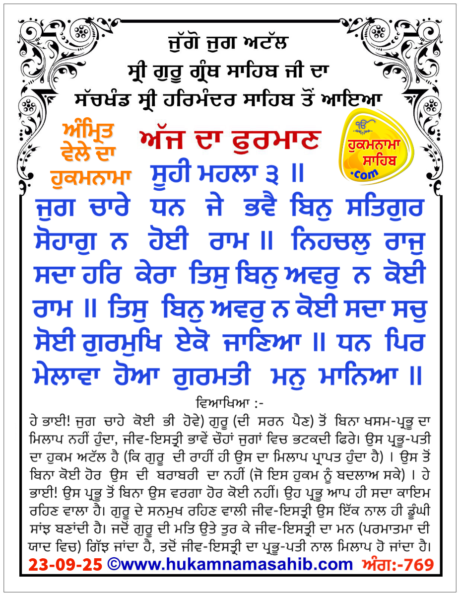 Amrit Vele Da Hukamnama Sri Darbar Sahib, Amritsar, Date 23-09-2025 Ang 769