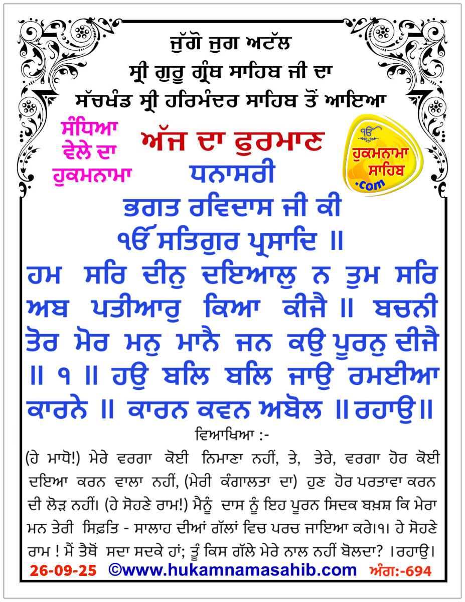 Sandhia Vele da Hukamnama Sri Darbar Sahib, Sri Amritsar, Ang 694, 026-09-2025