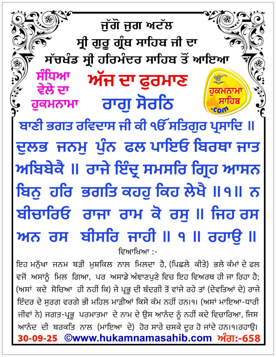 Sandhia Vele Da Hukamnama Sri Darbar Sahib, Amritsar, Date 30-09-2025 Ang 658