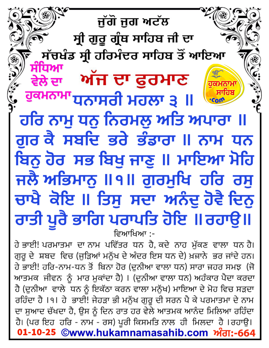 SANDHYA VELE DA HUKAMNAMA SRI DARBAR SAHIB SRI AMRITSAR,ANG 664, 01-10-2025