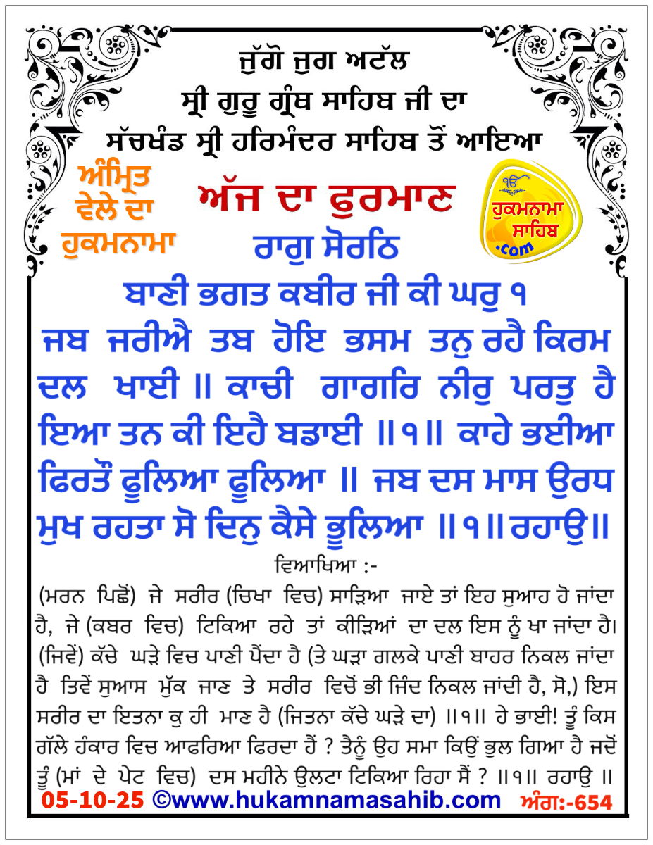 Amrit Vele Da Hukamnama Sri Darbar Sahib, Amritsar, Date 05-10-2025 Ang 654