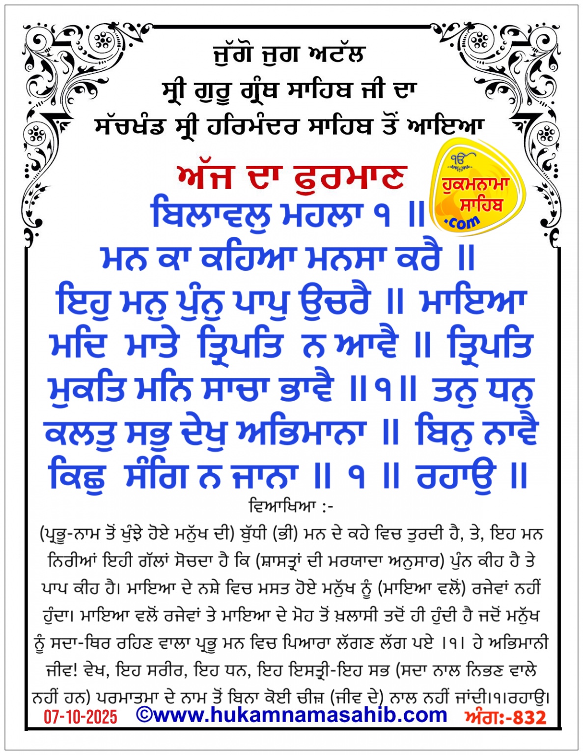 ਬਿਲਾਵਲੁ ਮਹਲਾ ੧ ॥ ਮਨ ਕਾ ਕਹਿਆ ਮਨਸਾ ਕਰੈ ॥ ਇਹੁ ਮਨੁ ਪੁੰਨੁ ਪਾਪੁ ਉਚਰੈ ॥ ਮਾਇਆ ਮਦਿ ਮਾਤੇ ਤ੍ਰਿਪਤਿ ਨ ਆਵੈ ॥ ਤ੍ਰਿਪਤਿ ਮੁਕਤਿ ਮਨਿ ਸਾਚਾ ਭਾਵੈ ॥੧॥ ਤਨੁ ਧਨੁ ਕਲਤੁ ਸਭੁ ਦੇਖੁ ਅਭਿਮਾਨਾ ॥ ਬਿਨੁ ਨਾਵੈ ਕਿਛੁ ਸੰਗਿ ਨ ਜਾਨਾ ॥੧॥ ਰਹਾਉ ॥ ਕੀਚਹਿ ਰਸ ਭੋਗ ਖੁਸੀਆ ਮਨ ਕੇਰੀ ॥ ਧਨੁ ਲੋਕਾਂ ਤਨੁ ਭਸਮੈ ਢੇਰੀ ॥ ਖਾਕੂ ਖਾਕੁ ਰਲੈ ਸਭੁ ਫੈਲੁ ॥ ਬਿਨੁ ਸਬਦੈ ਨਹੀ ਉਤਰੈ ਮੈਲੁ ॥੨॥ ਗੀਤ ਰਾਗ ਘਨ ਤਾਲ ਸਿ ਕੂਰੇ ॥ ਤ੍ਰਿਹੁ ਗੁਣ ਉਪਜੈ ਬਿਨਸੈ ਦੂਰੇ ॥ ਦੂਜੀ ਦੁਰਮਤਿ ਦਰਦੁ ਨ ਜਾਇ ॥ ਛੂਟੈ ਗੁਰਮੁਖਿ ਦਾਰੂ ਗੁਣ ਗਾਇ ॥੩॥ ਧੋਤੀ ਊਜਲ ਤਿਲਕੁ ਗਲਿ ਮਾਲਾ ॥ ਅੰਤਰਿ ਕ੍ਰੋਧੁ ਪੜਹਿ ਨਾਟ ਸਾਲਾ ॥ ਨਾਮੁ ਵਿਸਾਰਿ ਮਾਇਆ ਮਦੁ ਪੀਆ ॥ ਬਿਨੁ ਗੁਰ ਭਗਤਿ ਨਾਹੀ ਸੁਖੁ ਥੀਆ ॥੪॥ਸੂਕਰ ਸੁਆਨ ਗਰਧਭ ਮੰਜਾਰਾ ॥ ਪਸੂ ਮਲੇਛ ਨੀਚ ਚੰਡਾਲਾ ॥ ਗੁਰ ਤੇ ਮੁਹੁ ਫੇਰੇ ਤਿਨ੍ਹ੍ਹ ਜੋਨਿ ਭਵਾਈਐ ॥ ਬੰਧਨਿ ਬਾਧਿਆ ਆਈਐ ਜਾਈਐ ॥੫॥ ਗੁਰ ਸੇਵਾ ਤੇ ਲਹੈ ਪਦਾਰਥੁ ॥ ਹਿਰਦੈ ਨਾਮੁ ਸਦਾ ਕਿਰਤਾਰਥੁ ॥ ਸਾਚੀ ਦਰਗਹ ਪੂਛ ਨ ਹੋਇ ॥ ਮਾਨੇ ਹੁਕਮੁ ਸੀਝੈ ਦਰਿ ਸੋਇ ॥੬॥ ਸਤਿਗੁਰੁ ਮਿਲੈ ਤ ਤਿਸ ਕਉ ਜਾਣੈ ॥ ਰਹੈ ਰਜਾਈ ਹੁਕਮੁ ਪਛਾਣੈ ॥ ਹੁਕਮੁ ਪਛਾਣਿ ਸਚੈ ਦਰਿ ਵਾਸੁ ॥ ਕਾਲ ਬਿਕਾਲ ਸਬਦਿ ਭਏ ਨਾਸੁ ॥੭॥ ਰਹੈ ਅਤੀਤੁ ਜਾਣੈ ਸਭੁ ਤਿਸ ਕਾ ॥ ਤਨੁ ਮਨੁ ਅਰਪੈ ਹੈ ਇਹੁ ਜਿਸ ਕਾ ॥ ਨਾ ਓਹੁ ਆਵੈ ਨਾ ਓਹੁ ਜਾਇ ॥ ਨਾਨਕ ਸਾਚੇ ਸਾਚਿ ਸਮਾਇ ॥੮॥੨॥