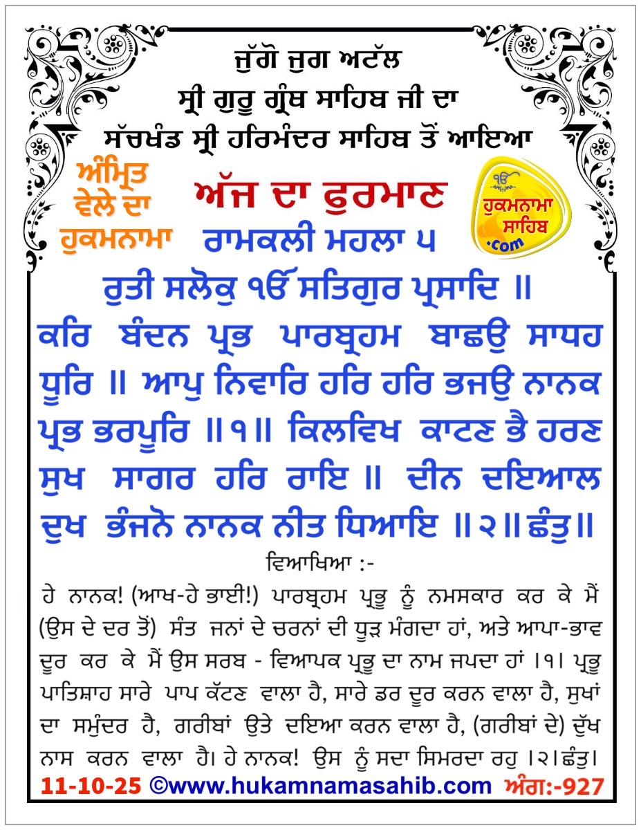 ਰਾਗ ਰਾਮਕਲੀ ਵਿੱਚ ਗੁਰੂ ਅਰਜਨਦੇਵ ਜੀ ਦੀ ਬਾਣੀ ‘ਰੁਤੀ ਸਲੋਕੁ’। ਅਕਾਲ ਪੁਰਖ ਇੱਕ ਹੈ ਅਤੇ ਸਤਿਗੁਰੂ ਦੀ ਕਿਰਪਾ ਨਾਲ ਮਿਲਦਾ ਹੈ। ਹੇ ਨਾਨਕ! (ਆਖ-ਹੇ ਭਾਈ!) ਪਾਰਬ੍ਰਹਮ ਪ੍ਰਭੂ ਨੂੰ ਨਮਸਕਾਰ ਕਰ ਕੇ ਮੈਂ (ਉਸ ਦੇ ਦਰ ਤੋਂ) ਸੰਤ ਜਨਾਂ ਦੇ ਚਰਨਾਂ ਦੀ ਧੂੜ ਮੰਗਦਾ ਹਾਂ, ਅਤੇ ਆਪਾ-ਭਾਵ ਦੂਰ ਕਰ ਕੇ ਮੈਂ ਉਸ ਸਰਬ-ਵਿਆਪਕ ਪ੍ਰਭੂ ਦਾ ਨਾਮ ਜਪਦਾ ਹਾਂ।੧। ਪ੍ਰਭੂ ਪਾਤਿਸ਼ਾਹ ਸਾਰੇ ਪਾਪ ਕੱਟਣ ਵਾਲਾ ਹੈ, ਸਾਰੇ ਡਰ ਦੂਰ ਕਰਨ ਵਾਲਾ ਹੈ, ਸੁਖਾਂ ਦਾ ਸਮੁੰਦਰ ਹੈ, ਗਰੀਬਾਂ ਉਤੇ ਦਇਆ ਕਰਨ ਵਾਲਾ ਹੈ, (ਗਰੀਬਾਂ ਦੇ) ਦੁੱਖ ਨਾਸ ਕਰਨ ਵਾਲਾ ਹੈ। ਹੇ ਨਾਨਕ! ਉਸ ਨੂੰ ਸਦਾ ਸਿਮਰਦਾ ਰਹੁ।੨। ਛੰਤੁ। ਹੇ ਵੱਡੇ ਭਾਗਾਂ ਵਾਲਿਓ! ਪਰਮਾਤਮਾ ਦੀ ਸਿਫ਼ਤਿ-ਸਾਲਾਹ ਦਾ ਗੀਤ ਗਾਂਦੇ ਰਿਹਾ ਕਰੋ। ਹੇ ਭਗਵਾਨ! (ਮੇਰੇ ਉਤੇ) ਮਿਹਰ ਕਰ (ਮੈਂ ਭੀ ਤੇਰਾ ਜਸ ਗਾਂਦਾ ਰਹਾਂ। ਹੇ ਭਾਈ! ਜਿਹੜੀਆਂ ਰੁੱਤਾਂ, ਜਿਹੜੇ ਮੁਹੂਰਤ, ਜਿਹੜੀਆਂ ਘੜੀਆਂ ਪਰਮਾਤਮਾ ਦੇ ਗੁਣ ਉਚਾਰਦਿਆਂ ਬੀਤਣ, ਉਹ ਸਮੇ ਸੋਭਾ ਵਾਲੇ ਹੁੰਦੇ ਹਨ। ਹੇ ਭਾਈ! ਜਿਹੜੇ ਬੰਦੇ ਪਰਮਾਤਮਾ ਦੇ ਗੁਣਾਂ ਦੇ ਪਿਆਰ-ਰੰਗ ਵਿਚ ਰੰਗੇ ਰਹਿੰਦੇ ਹਨ, ਜਿਨ੍ਹਾਂ ਬੰਦਿਆਂ ਨੇ ਇਕ-ਮਨ ਹੋ ਕੇ ਪਰਮਾਤਮਾ ਦਾ ਸਿਮਰਨ ਕੀਤਾ ਹੈ, ਉਹ ਬੰਦੇ ਭਾਗਾਂ ਵਾਲੇ ਹਨ। ਹੇ ਭਾਈ! (ਸਿਮਰਨ ਦੀ ਬਰਕਤਿ ਨਾਲ) ਜਿਨ੍ਹਾਂ ਨੇ ਪਰਮਾਤਮਾ ਦਾ ਮਿਲਾਪ ਹਾਸਲ ਕਰ ਲਿਆ ਹੈ ਉਹਨਾਂ ਦਾ ਮਨੁੱਖਾ ਜੀਵਨ ਕਾਮਯਾਬ ਹੋ ਗਿਆ ਹੈ। ਹੇ ਭਾਈ! ਪਰਮਾਤਮਾ (ਦਾ ਨਾਮ) ਸਾਰੇ ਪਾਪਾਂ ਦਾ ਨਾਸ ਕਰਨ ਵਾਲਾ ਹੈ, ਕੋਈ ਪੁੰਨ-ਦਾਨ ਕੋਈ ਧਾਰਮਿਕ ਕਰਮ ਹਰਿ-ਨਾਮ ਸਿਮਰਨ ਦੇ ਬਰਾਬਰ ਨਹੀਂ ਹਨ। ਨਾਨਕ ਬੇਨਤੀ ਕਰਦਾ ਹੈ– ਹੇ ਭਾਈ! ਪਰਮਾਤਮਾ ਦਾ ਨਾਮ ਸਿਮਰ ਕੇ ਮੈਂ ਆਤਮਕ ਜੀਵਨ ਪ੍ਰਾਪਤ ਕਰਦਾ ਹਾਂ। (ਸਿਮਰਨ ਦੀ ਬਰਕਤ ਨਾਲ) ਜਨਮ ਮਰਨ (ਦੇ ਗੇੜ) ਮੁੱਕ ਜਾਂਦੇ ਹਨ।੧।