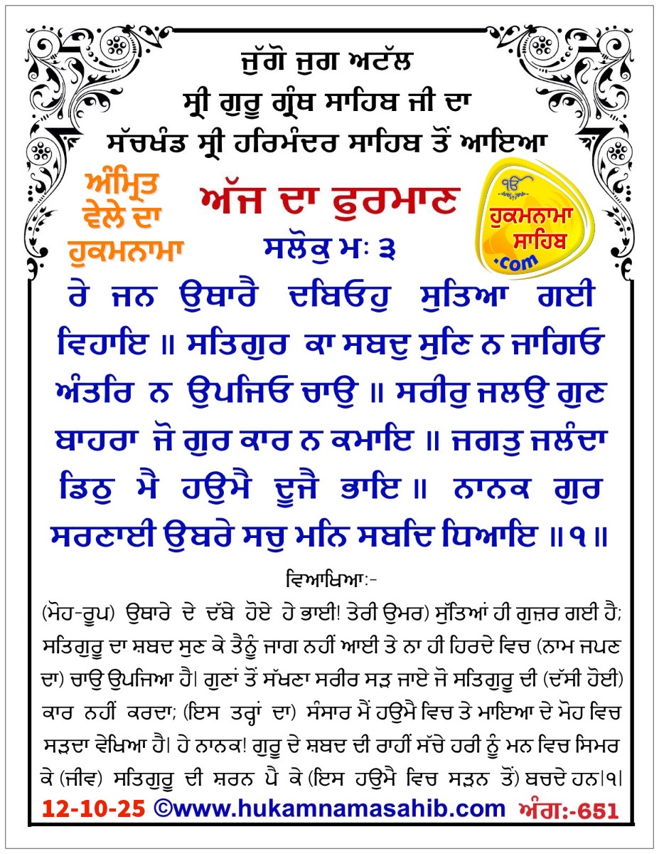 Amrit Vele Da Hukamnama Sri Darbar Sahib, Amritsar, Date 12-10-2024 Ang 651