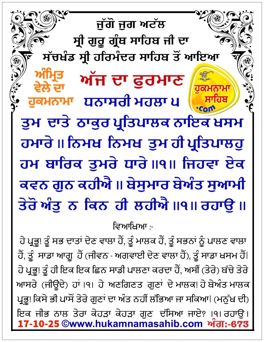 Amrit Vele Da Hukamnama Sri Darbar Sahib, Amritsar, Date 17-10-2025 Ang 673