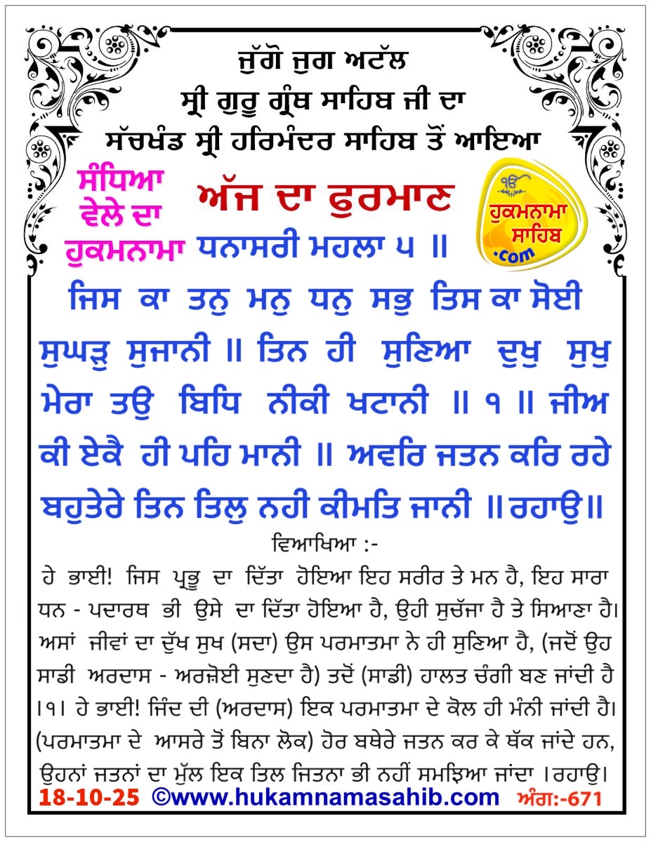 Sandhia Vele Da Hukamnama Sri Darbar Sahib, Amritsar, Date 18-10-2025 Ang 671