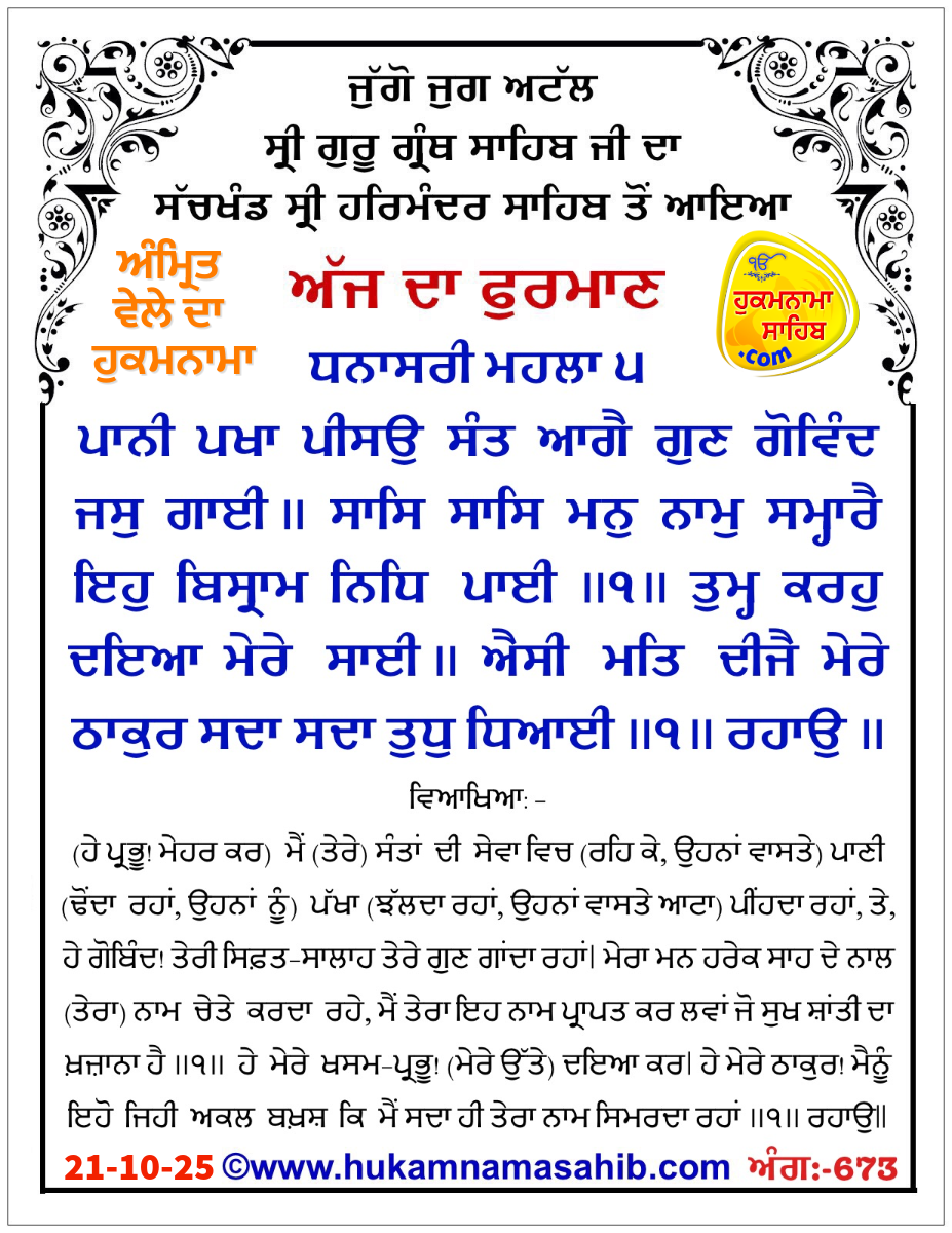 Amrit Vele Da Hukamnama Sri Darbar Sahib, Amritsar, Date 21-10-2025 Ang 673