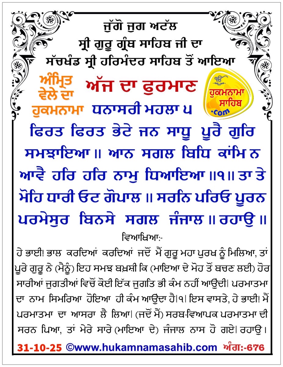 Amrit Vele Da Hukamnama Sri Darbar Sahib, Amritsar, Date 31-10-2025 Ang 676