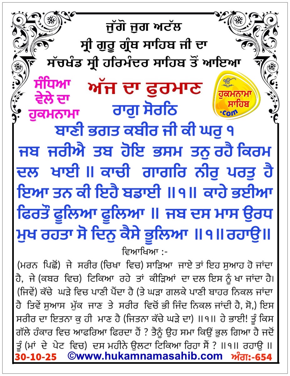 Meaning: Raag Sorath, The Word Of Devotee Kabeer Jee, First House: When the body is burnt, it turns to ashes; if it is not cremated, then it is eaten by armies of worms. The unbaked clay pitcher dissolves, when water is poured into it; this is also the nature of the body. ||1|| Why, O Siblings of Destiny, do you strut around, all puffed up with pride ? Have you forgotten those days, when you were hanging, face down, for ten months ? ||1|| Pause || Like the bee which collects honey, the fool eagerly gathers and collects wealth. At the time of death, they shout, “”Take him away, take him away! Why leave a ghost lying around ?””||2|| His wife accompanies him to the threshold, and his friends and companions beyond. All the people and relatives go as far as the cremation grounds, and then, the soul-swan goes on alone. ||3|| Says Kabeer Ji, listen, O mortal being: you have been seized by Death, and you have fallen into the deep, dark pit. You have entangled yourself in the false wealth of Maya, like the parrot caught in the trap. ||4||2||