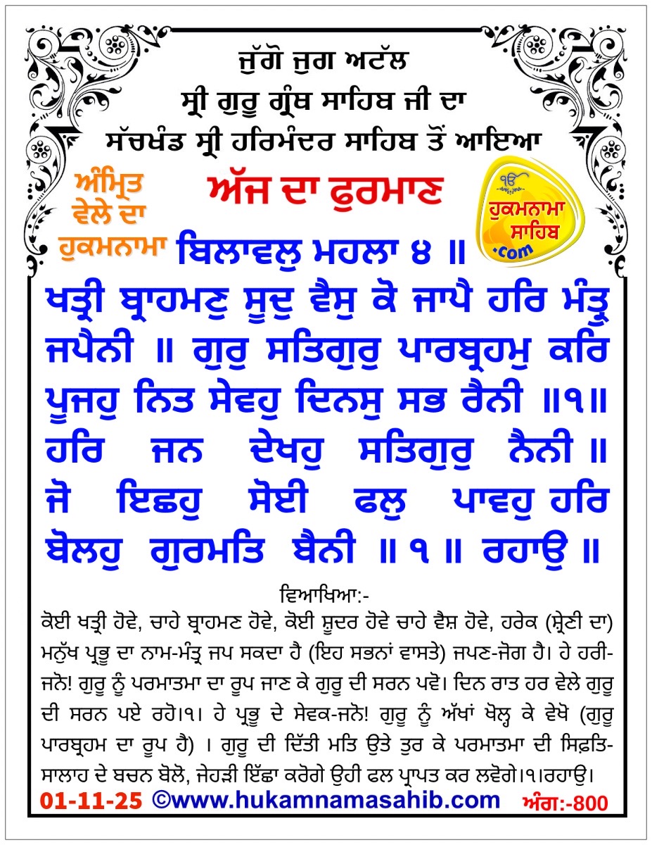 Amrit vele da Hukamnama Sri Darbar Sahib, Sri Amritsar, Ang, 800, 01-11-2025