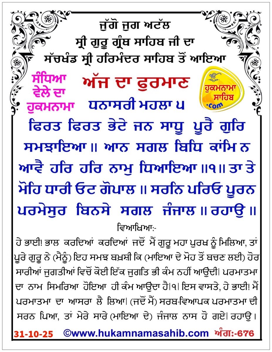 Sandhia Vele Da Hukamnama Sri Darbar Sahib, Amritsar, Date 31-10-2025 Ang 676