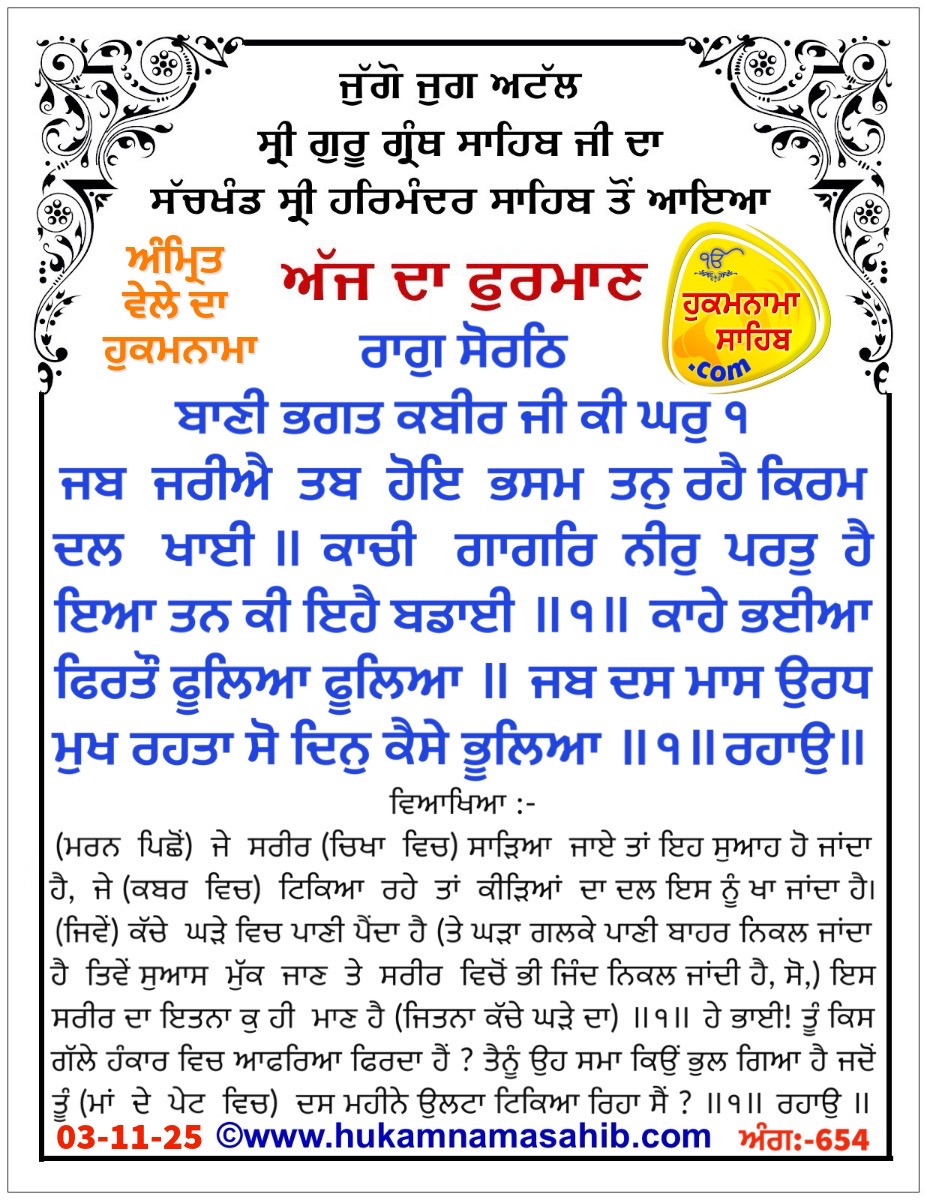 Meaning: Raag Sorath, The Word Of Devotee Kabeer Jee, First House: When the body is burnt, it turns to ashes; if it is not cremated, then it is eaten by armies of worms. The unbaked clay pitcher dissolves, when water is poured into it; this is also the nature of the body. ||1|| Why, O Siblings of Destiny, do you strut around, all puffed up with pride ? Have you forgotten those days, when you were hanging, face down, for ten months ? ||1|| Pause || Like the bee which collects honey, the fool eagerly gathers and collects wealth. At the time of death, they shout, “”Take him away, take him away! Why leave a ghost lying around ?””||2|| His wife accompanies him to the threshold, and his friends and companions beyond. All the people and relatives go as far as the cremation grounds, and then, the soul-swan goes on alone. ||3|| Says Kabeer Ji, listen, O mortal being: you have been seized by Death, and you have fallen into the deep, dark pit. You have entangled yourself in the false wealth of Maya, like the parrot caught in the trap. ||4||2||