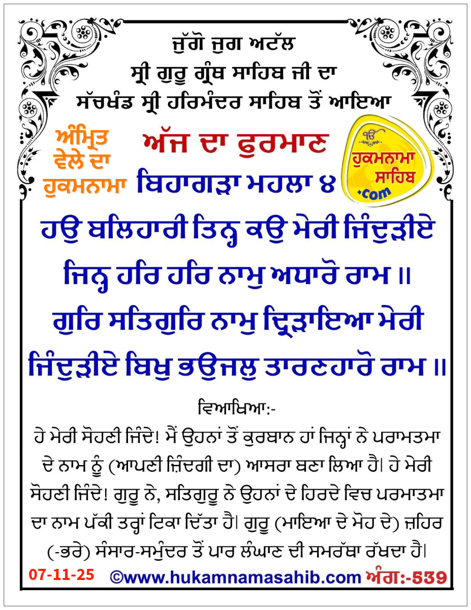 Meaning: I am a sacrifice, O my soul, to those who take the Support of the Name of the Lord, Har, Har. The Guru, the True Guru, implanted the Name within me, O my soul, and He has carried me across the terrifying world-ocean of poison. Those who have meditated one-pointedly on the Lord, O my soul – I proclaim the Victory of those saintly beings. Nanak Ji has found peace, meditating on the Lord, O my soul; the Lord is the Destroyer of all pain. ||1|| Blessed, blessed is that tongue, O my soul, which sings the Glorious Praises of the Lord God. Sublime and splendid are those ears, O my soul, which listen to the Kirtan of the Lord’s Praises. Sublime, pure and pious is that head, O my soul, which falls at the Guru’s Feet. Nanak Ji is a sacrifice to that Guru, O my soul; the Guru has placed the Name of the Lord, Har, Har, in my mind. ||2|| Blessed and approved are those eyes, O my soul, which gaze upon the Holy True Guru. Sacred and sanctified are those hands, O my soul, which write the Praises of the Lord, Har, Har. I worship continually the feet of that humble being, O my soul, who walks on the Path of Dharma – the path of righteousness. Nanak Ji is a sacrifice to those, O my soul, who hear of the Lord, and believe in the Lord’s Name. ||3|| The earth, the nether regions of the underworld, and the Akaashic ethers, O my soul, all meditate on the Name of the Lord, Har, Har. Wind, water and fire, O my soul, continually sing the Praises of the Lord, Har, Har, Har. The woods, the meadows* *and the whole world, O my soul, chant with their mouths the Lord’s Name, and meditate on the Lord. O Nanak Ji, one who, as Gurmukh, focuses his consciousness on the Lord’s devotional worship – O my soul, he is robed in honor in the Court of the Lord. ||4||4||