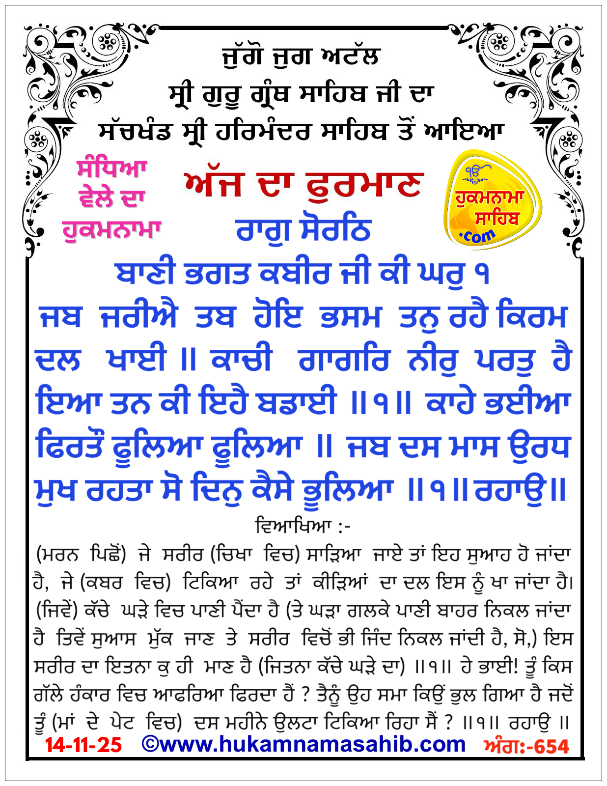 Meaning: Raag Sorath, The Word Of Devotee Kabeer Jee, First House: When the body is burnt, it turns to ashes; if it is not cremated, then it is eaten by armies of worms. The unbaked clay pitcher dissolves, when water is poured into it; this is also the nature of the body. ||1|| Why, O Siblings of Destiny, do you strut around, all puffed up with pride ? Have you forgotten those days, when you were hanging, face down, for ten months ? ||1|| Pause || Like the bee which collects honey, the fool eagerly gathers and collects wealth. At the time of death, they shout, “”Take him away, take him away! Why leave a ghost lying around ?””||2|| His wife accompanies him to the threshold, and his friends and companions beyond. All the people and relatives go as far as the cremation grounds, and then, the soul-swan goes on alone. ||3|| Says Kabeer Ji, listen, O mortal being: you have been seized by Death, and you have fallen into the deep, dark pit. You have entangled yourself in the false wealth of Maya, like the parrot caught in the trap. ||4||2||