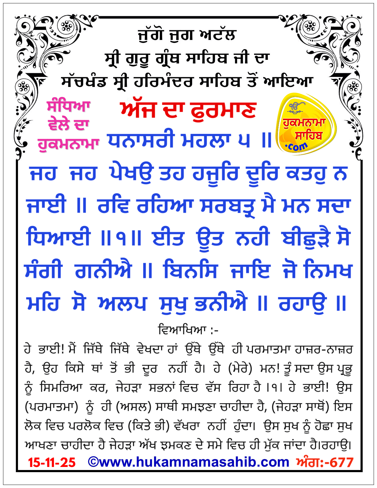 Sandhia Vele Da Hukamnama Sri Darbar Sahib, Amritsar, Date 15-11-2025 Ang 677